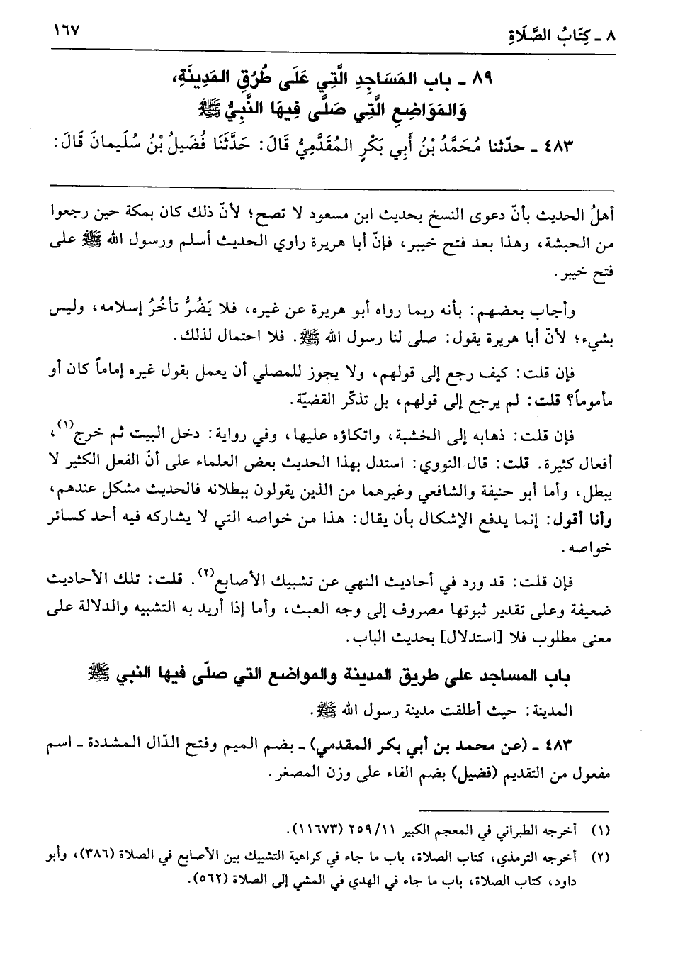 483 - (عن محمد بن أبي بكر المقدمي) -بضم الميم وفتح الدّال المشددة- اسم مفعول من التقديم (فضيل) بضم الفاء على وزن المصغر.