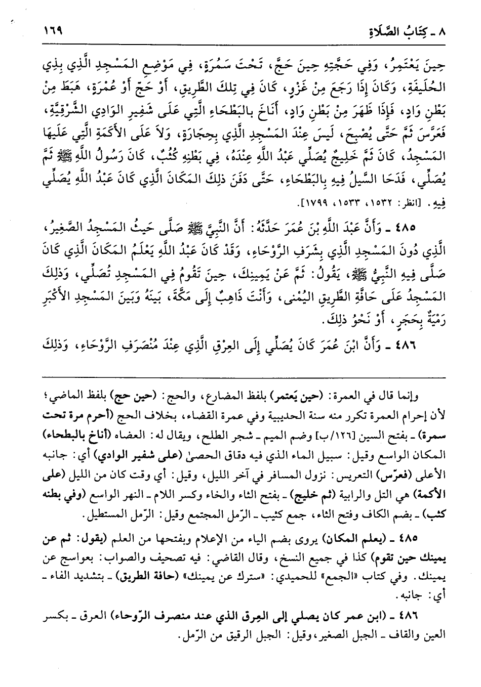 486 - (ابن عمر كان يصلي إلى العِرق الذي عند منصرف الرّوحاء) العرف -بكسر العين والقاف- الجبل الصغير، وقيل: الجبل الرقيق من الرمل.