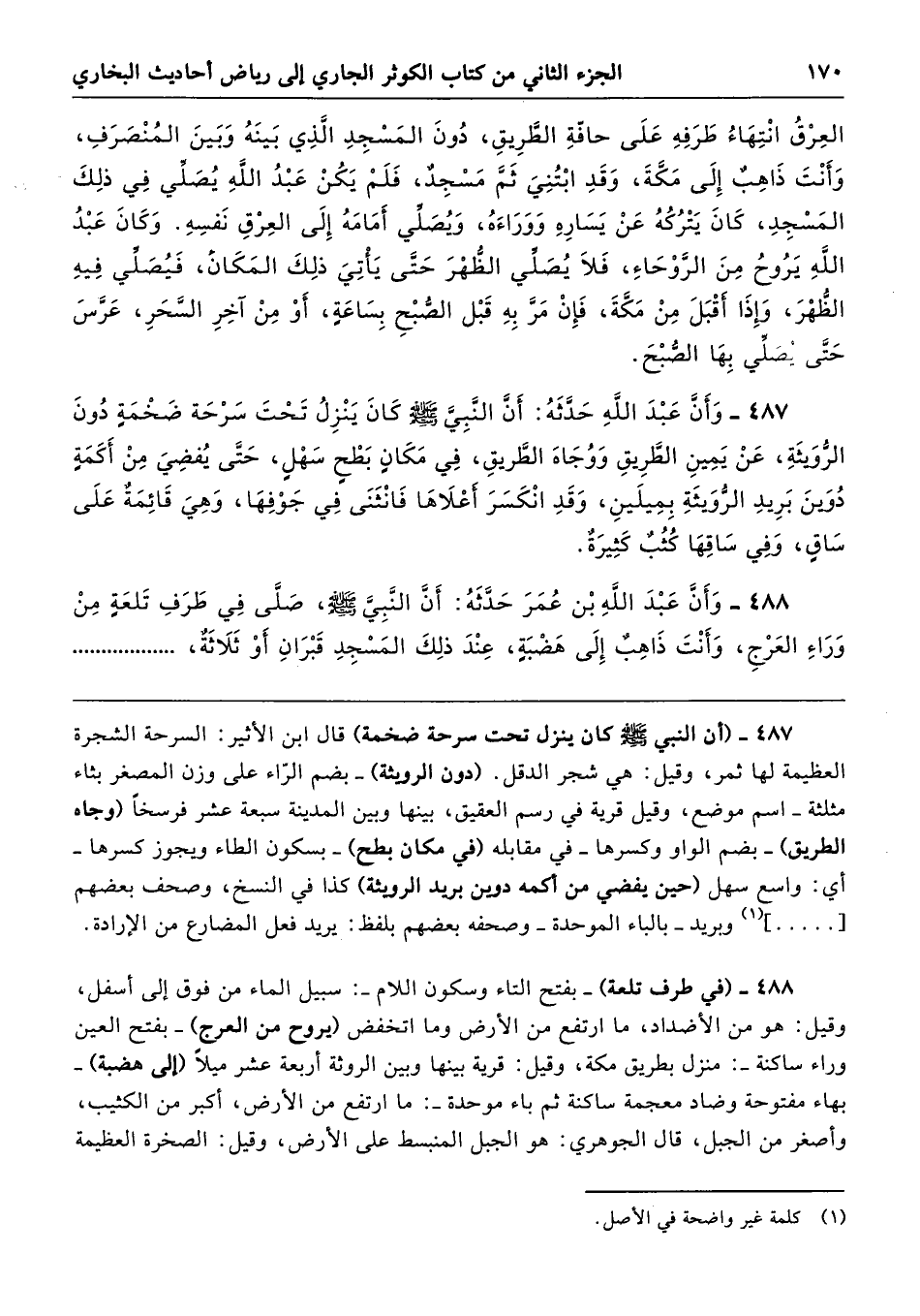 487 - (أن النبي - صلى الله عليه وسلم - كان ينزل تحت سرحة ضخمة) قال ابن الأثير: السرحة الشجرة العظيمة لها ثمر، وقيل: هي شجر الدقل. (دون الرويثة) -بضم الرّاء على وزن المصغر بثاء مثلثة- اسم موضع، وقيل قرية في رسم العقيق، بينها وبين المدينة سبعة عشر فرسخًا (وجاه الطريق) -بضم الواو وكسرها- في مقابله (في مكان بطح) -بسكون الطاء ويجوز كسرها- أي: واسع سهل (حين يفضي من أكمه دوين بريد الرويثة) كذا في النسخ، وصحف بعضهم وبريد -بالباء الموحدة- وصحفه بعضهم بلفظ: يريد فعل المضارع من الإرادة.