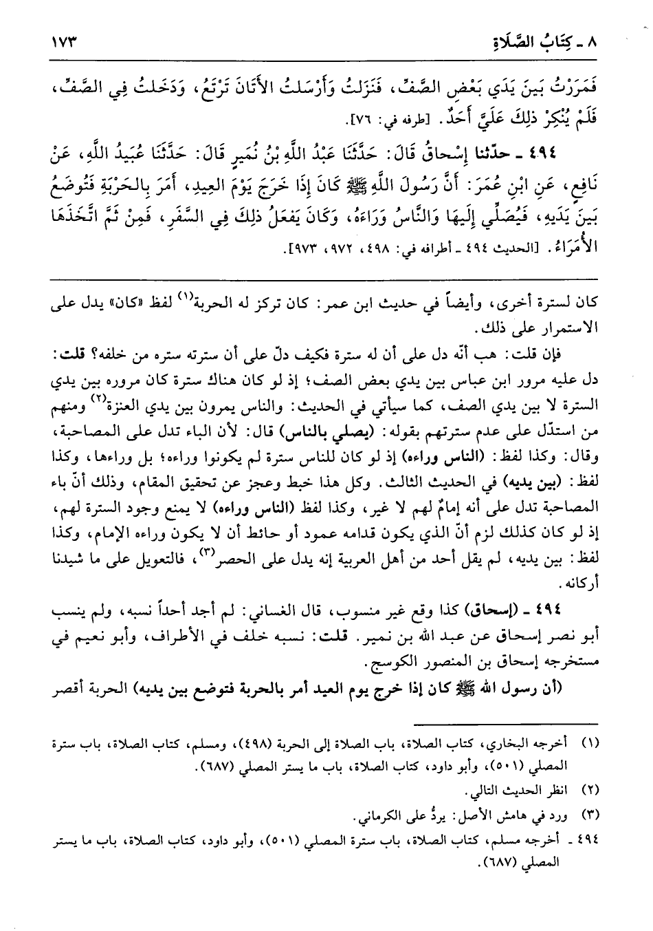 494 - حَدَّثَنَا إِسْحَاقُ قَالَ حَدَّثَنَا عَبْدُ اللَّهِ بْنُ نُمَيْرٍ قَالَ حَدَّثَنَا عُبَيْدُ اللَّهِ عَنْ نَافِعٍ عَنِ ابْنِ عُمَرَ أَنَّ رَسُولَ اللَّهِ - صلى الله عليه وسلم - كَانَ إِذَا خَرَجَ يَوْمَ الْعِيدِ أَمَرَ بِالْحَرْبَةِ فَتُوضَعُ بَيْنَ يَدَيْهِ، فَيُصَلِّى إِلَيْهَا وَالنَّاسُ وَرَاءَهُ، وَكَانَ يَفْعَلُ ذَلِكَ فِي السَّفَرِ، فَمِنْ ثَمَّ اتَّخَذَهَا الأُمَرَاءُ. أطرافه 498، 972، 973