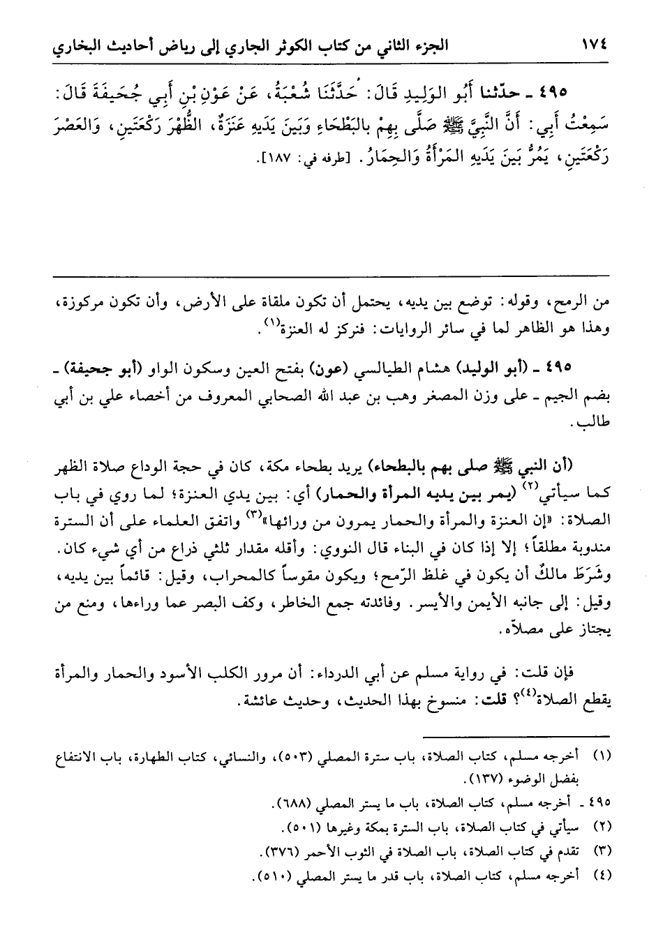 495 - حَدَّثَنَا أَبُو الْوَلِيدِ قَالَ حَدَّثَنَا شُعْبَةُ عَنْ عَوْنِ بْنِ أَبِى جُحَيْفَةَ قَالَ سَمِعْتُ أَبِى أَنَّ النَّبِىَّ - صلى الله عليه وسلم - صَلَّى بِهِمْ بِالْبَطْحَاءِ - وَبَيْنَ يَدَيْهِ عَنَزَةٌ - الظُّهْرَ رَكْعَتَيْنِ، وَالْعَصْرَ رَكْعَتَيْنِ، تَمُرُّ بَيْنَ يَدَيْهِ الْمَرْأَةُ وَالْحِمَارُ. طرفه 187