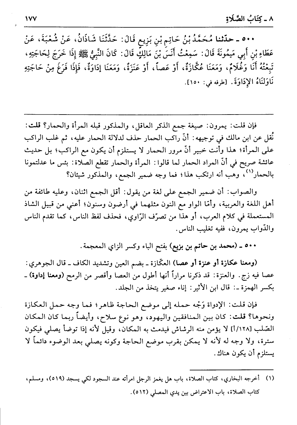 500 - حَدَّثَنَا مُحَمَّدُ بْنُ حَاتِمِ بْنِ بَزِيعٍ قَالَ حَدَّثَنَا شَاذَانُ عَنْ شُعْبَةَ عَنْ عَطَاءِ بْنِ أَبِى مَيْمُونَةَ قَالَ سَمِعْتُ أَنَسَ بْنَ مَالِكٍ قَالَ كَانَ النَّبِىُّ - صلى الله عليه وسلم - إِذَا خَرَجَ لِحَاجَتِهِ تَبِعْتُهُ أَنَا وَغُلاَمٌ وَمَعَنَا عُكَّازَةٌ أَوْ عَصًا أَوْ عَنَزَةٌ وَمَعَنَا إِدَاوَةٌ، فَإِذَا فَرَغَ مِنْ حَاجَتِهِ نَاوَلْنَاهُ الإِدَاوَةَ. طرفه 150
