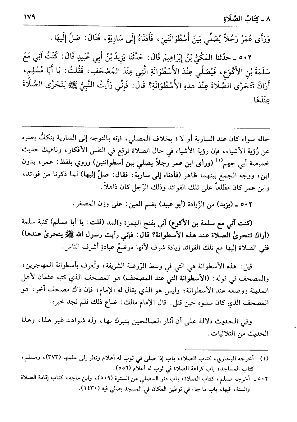 502 - حَدَّثَنَا الْمَكِّىُّ بْنُ إِبْرَاهِيمَ قَالَ حَدَّثَنَا يَزِيدُ بْنُ أَبِى عُبَيْدٍ قَالَ كُنْتُ آتِى مَعَ سَلَمَةَ بْنِ الأَكْوَعِ فَيُصَلِّى عِنْدَ الأُسْطُوَانَةِ الَّتِى عِنْدَ الْمُصْحَفِ. فَقُلْتُ يَا أَبَا مُسْلِمٍ أَرَاكَ تَتَحَرَّى الصَّلاَةَ عِنْدَ هَذِهِ الأُسْطُوَانَةِ. قَالَ فَإِنِّى رَأَيْتُ النَّبِىَّ - صلى الله عليه وسلم - يَتَحَرَّى الصَّلاَةَ عِنْدَهَا.