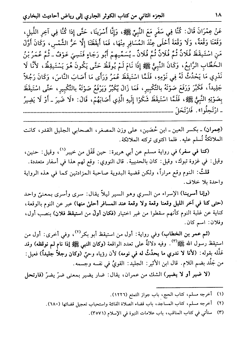 عَنْ عِمْرَانَ قَالَ كُنَّا فِي سَفَرٍ مَعَ النَّبِيِّ - صلى الله عليه وسلم - وَإِنَّا أَسْرَيْنَا، حَتَّى كُنَّا فِي آخِرِ اللَّيْلِ، وَقَعْنَا وَقْعَةً وَلاَ وَقْعَةَ أَحْلَى عِنْدَ الْمُسَافِرِ مِنْهَا، فَمَا أَيْقَظَنَا إِلاَّ حَرُّ الشَّمْسِ، وَكَانَ أَوَّلَ مَنِ اسْتَيْقَظَ فُلاَنٌ ثُمَّ فُلاَنٌ ثُمَّ فُلاَنٌ - يُسَمِّيهِمْ أَبُو رَجَاءٍ فَنَسِىَ عَوْفٌ - ثُمَّ عُمَرُ بْنُ الْخَطَّابِ الرَّابِعُ، وَكَانَ النَّبِىُّ - صلى الله عليه وسلم - إِذَا نَامَ لَمْ يُوقَظْ حَتَّى يَكُونَ هُوَ يَسْتَيْقِظُ، لأَنَّا لاَ نَدْرِى مَا يَحْدُثُ لَهُ فِي نَوْمِهِ، فَلَمَّا اسْتَيْقَظَ عُمَرُ، وَرَأَى مَا أَصَابَ النَّاسَ، وَكَانَ رَجُلاً جَلِيدًا، فَكَبَّرَ وَرَفَعَ صَوْتَهُ بِالتَّكْبِيرِ، فَمَا زَالَ يُكَبِّرُ وَيَرْفَعُ صَوْتَهُ بِالتَّكْبِيرِ حَتَّى اسْتَيْقَظَ لِصَوْتِهِ النَّبِىُّ - صلى الله عليه وسلم - فَلَمَّا اسْتَيْقَظَ شَكَوْا إِلَيْهِ الَّذِى أَصَابَهُمْ قَالَ «لاَ ضَيْرَ - أَوْ لاَ يَضِيرُ - ارْتَحِلُوا». فَارْتَحَلَ