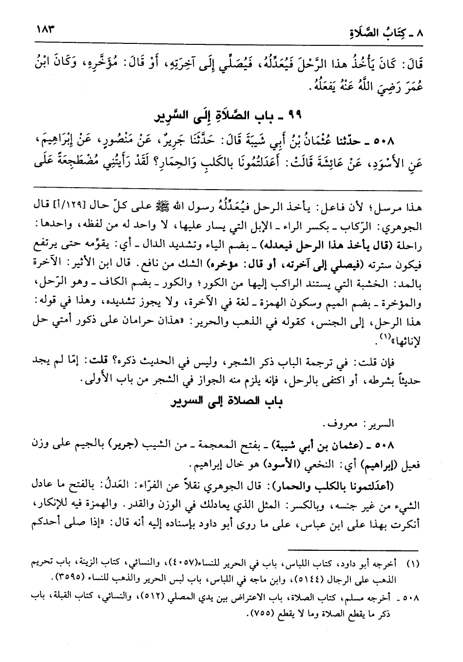 508 - حَدَّثَنَا عُثْمَانُ بْنُ أَبِى شَيْبَةَ قَالَ حَدَّثَنَا جَرِيرٌ عَنْ مَنْصُورٍ عَنْ إِبْرَاهِيمَ عَنِ الأَسْوَدِ عَنْ عَائِشَةَ قَالَتْ أَعَدَلْتُمُونَا بِالْكَلْبِ وَالْحِمَارِ لَقَدْ رَأَيْتُنِى مُضْطَجِعَةً عَلَى