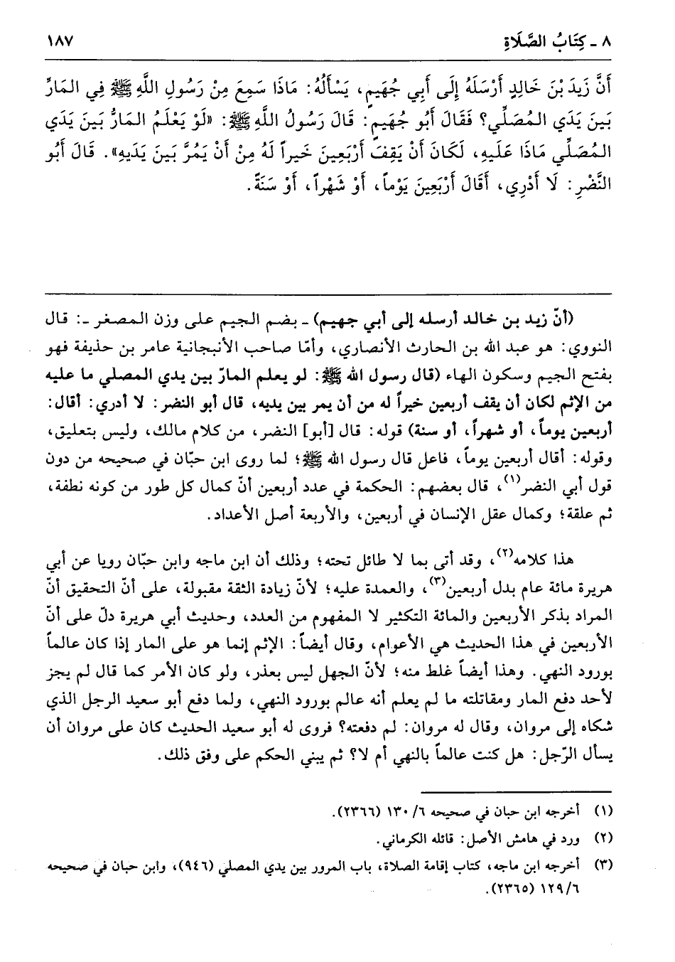 (أنّ زيد بن خالد أرسله إلى أبي جهيم) -بضم الجيم على وزن المصغر-: قال النووي: هو عبد الله بن الحارث الأنصاري، وأمّا صاحب الأنبجانية عامر بن حذيفة فهو بفتح الجيم وسكون الهاء (قال رسول الله - صلى الله عليه وسلم -: لو يعلم المارّ بين يدي المصلي ما عليه من الإثم لكان أن يقف أربعين خيرًا له من أن يمر بين يديه، قال أبو النضر: لا أدري: أقال: أربعين يومًا، أو شهرًا، أو سنة) قوله: قال [أبو] النضر، من كلام مالك، وليس بتعليق، وقوله: أقال أربعين يومًا، فاعل قال رسول الله - صلى الله عليه وسلم -؛ لما روى ابن حبّان في صحيحه من دون قول أبي النضر، قال بعضهم: الحكمة في عدد أربعين أنّ كمال كل طور من كونه نطفة، ثم علقة؛ وكمال عقل الإنسان في أربعين، والأربعة أصل الأعداد.