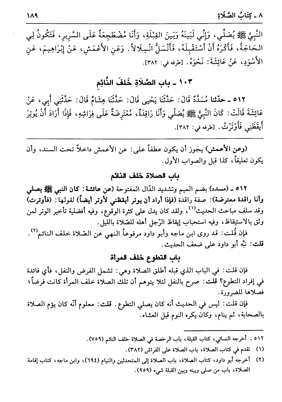 512 - (مسدد) بضم الميم وتشديد الدّال المفتوحة (عن عائشة: كان النبي - صلى الله عليه وسلم - يصلي وأنا راقدة معترضة): صفة راقدة (فإذا أراد أن يوتر أيقظني لأوتر أيضًا) لقولها: (فأوترت) وقد سلف مباحث الحديث، ولقد كان يدل على كثرة الوقوع، وفيه أفضلية تأخير الوتر لمن وثق بالاستيقاظ، وفيه استحباب إيقاظ الرّجل أهله للصّلاة بالليل.