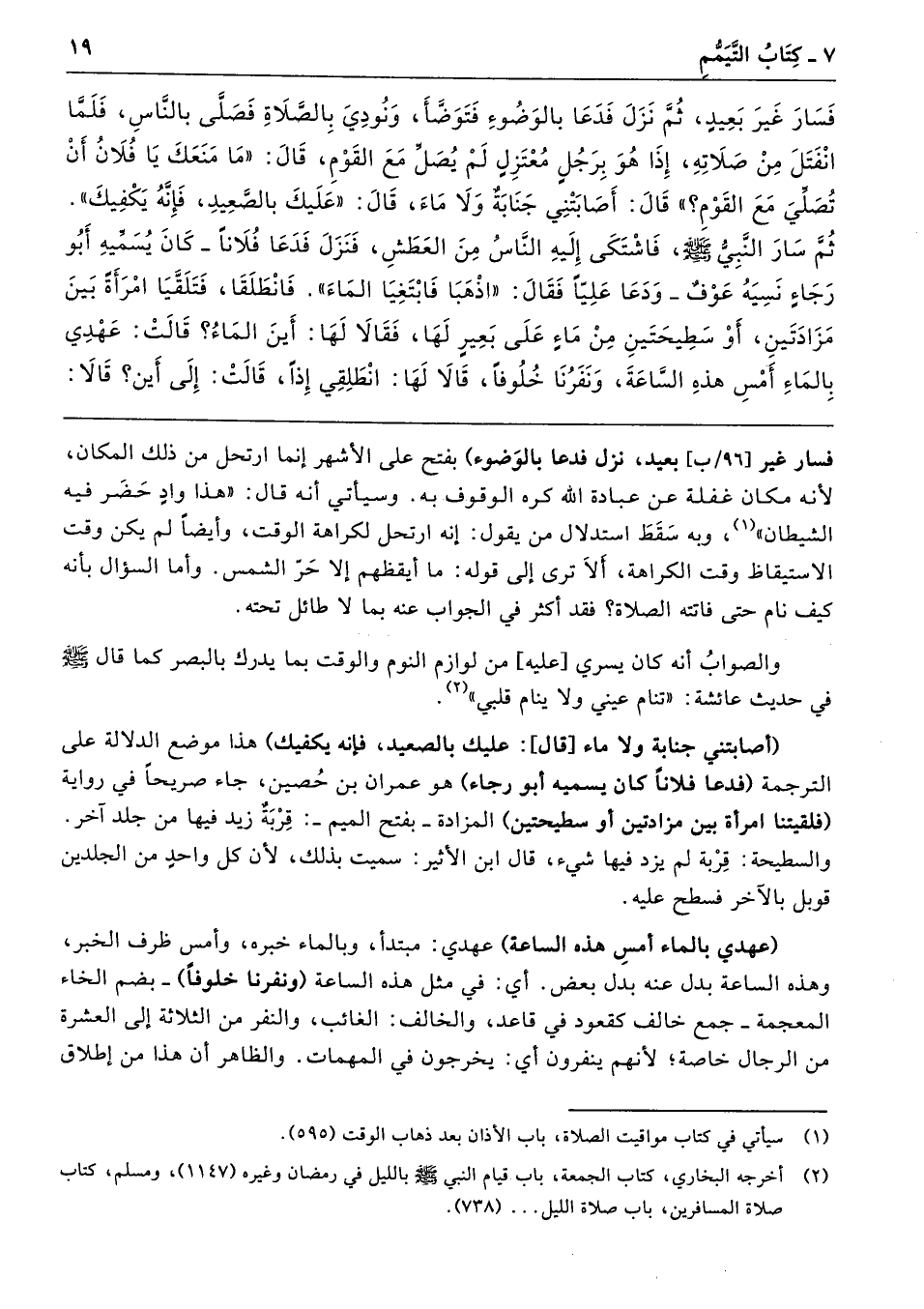 (أصابتني جنابة ولا ماء [قال]: عليك بالصعيد، فإنَّه يكفيك) هذا موضع الدلالة على الترجمة (فدعا فلانًا كان يسميه أبو رجاء) هو عمران بن حُصين، جاء صريحًا في رواية (فلقيتنا امرأة بين مزادتين أوسطيحتين) المزادة -بفتح الميم-: قِرْبَةٌ زيد فيها من جلد آخر.