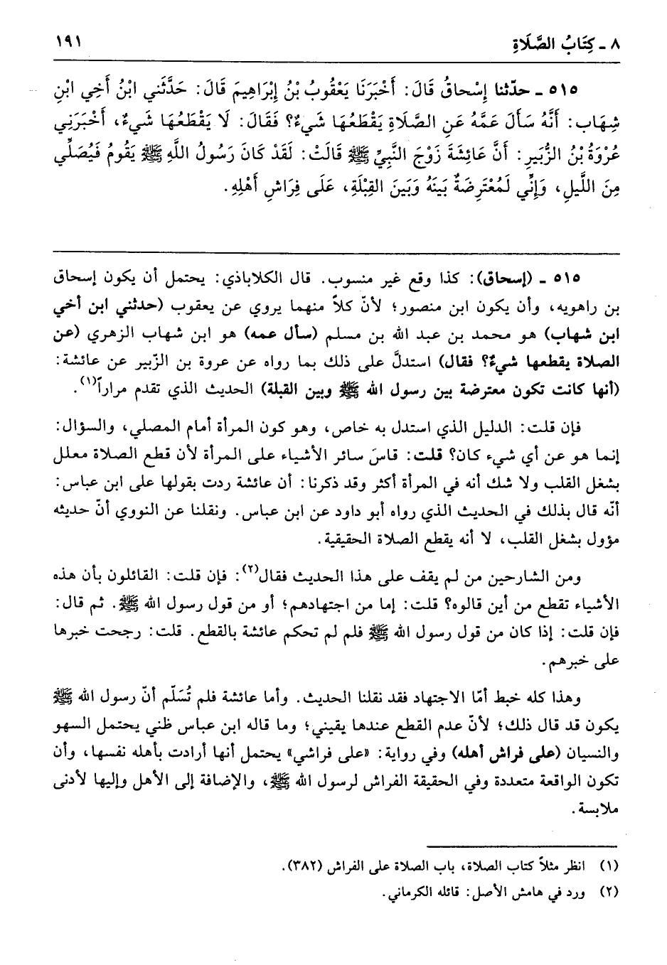 515 - (إسحاق): كذا وقع غير منسوب. قال الكلاباذي: يحتمل أن يكون إسحاق بن راهويه، وأن يكون ابن منصور؛ لأن كلًّا منهما يروي عن يعقوب (حدثني ابن أخي ابن شهاب) هو محمد بن عبد الله بن مسلم (سأل عمه) هو ابن شهاب الزهري (عن الصلاة يقطعها شيءٌ؟ فقال) استدلَّ على ذلك بما رواه عن عروة بن الزبير عن عائشة: (أنها كانت تكون معترضة بين رسول الله - صلى الله عليه وسلم - وبين القبلة) الحديث الذي تقدم مرارًا.