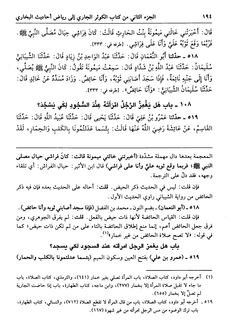 518 - (أبو النعمان) -بضم النون- محمد بن الفضل (فإذا سجد أصابني ثوبه وأنا حائض).