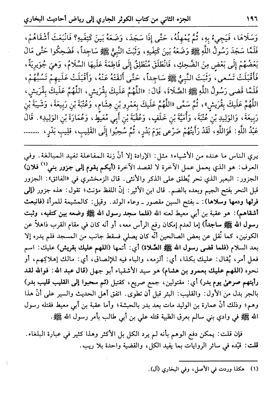 يري الناس ما عنده من الأشياء؛ مثل: الإرادة إلا أن زنة المفاعلة تفيد المبالغة. وفي العرف: هو الذي يعمل عمل الآخرة لا لقصد الآخرة (أيكم يقوم إلى جزور بني فلان) الجزور: البعير الذي نحر يُطلق على الذكر والأنثى. قال الزمخشري في "الفائق": الجزور قبل النحر بفتح الجيم وبعده بالضم. قال ابن الأثير: إن اللفظ مؤنث؛ تقول: هذه جزور (إلى فرثها ودمها وسلاها): -بفتح السين مقصور- وعاء الولد. وقيل: كالمشيمة للمرأة (فانبعث أشقاهم): هو عقبة بن أبي معيط لعنه الله (فلما سجد رسول الله - صلى الله عليه وسلم - وضعه بين كتفيه، وثبت رسول الله - صلى الله عليه وسلم - ساجدًا) إما لعدم إمكان رفع الرأس معه، أو أنه كان في مقام القرب ذاهلًا عن الكونين، كما نُقل عن بعض الصالحين أنه كان يصلي فسقط جانب من المسجد فلم يدره إلا بعد السلام (فلما قضى رسول الله - صلى الله عليه وسلم - الصَّلاة) أي: أتمها (اللهم عليك بقريش) عليك: اسم فعل أمر، يُقال: عليك بكذا، أي: ألزمه، والباء فيه للإلصاق، أي: مالك إهلاكِهم، أو نحوه (اللهم عليك بعمرو بن هشام) هو سيد الأشقياء أبو جهل (قال عبد الله: فوالله لقد رأيتهم صرعى يوم بدر) أي: مقتولين، جمع صريع، كقتيل (ثم سحبوا إلى القليب قليب بدر) بالجر بدل من الأول: والقليب: البئر قبل أن تطوى. اتفق أهل الحديث والسير على أنّ هذا وهم؛ وذلك أن عمارة بن الوليد مات بعد بدر بالحبشة؛ وأما عقبة بن أبي معيط فقتله رسول الله - صلى الله عليه وسلم - في وادي بني سالم بعرق الظبية قتله علي بن أبي طالب بأمر رسول الله - صلى الله عليه وسلم -.