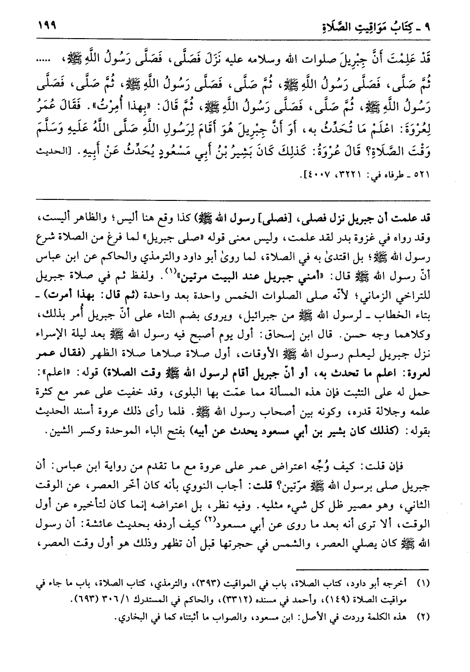 قد علمت أن جبريل نزل فصلى، [فصلى] رسول الله - صلى الله عليه وسلم -) كذا وقع هنا أليس؛ والظاهر أليست، وقد رواه في غزوة بدر لقد علمت، وليس معنى قوله "صلى جبريل" لما فرغ من الصلاة شرع رسول الله - صلى الله عليه وسلم -؛ بل اقتدى به في الصلاة، لما روى أبو داود والترمذي والحاكم عن ابن عباس أن رسول الله - صلى الله عليه وسلم - قال: "أمني جبريل عند البيت مرتين". ولفظ ثم في صلاة جبريل للتراخي الزماني؛ لأنه صلى الصلوات الخمس واحدة بعد واحدة (ثم قال: بهذا أمرت) -بتاء الخطاب- لرسول الله - صلى الله عليه وسلم - من جبرائيل، ويروى بضم التاء على أن جبريل أُمر بذلك، وكلاهما وجه حسن. قال ابن إسحاق: أول يوم أصبح فيه رسول الله - صلى الله عليه وسلم - بعد ليلة الإسراء نزل جبريل ليعلم رسول الله - صلى الله عليه وسلم - الأوقات، أول صلاة صلاها صلاة الظهر (فقال عمر لعروة: اعلم ما تحدث به، أو أن جبريل أقام لرسول الله - صلى الله عليه وسلم - وقت الصلاة) قوله: "اعلم": حمل له على التثبت فإن هذه المسألة مما عمّت بها البلوى، وقد خفيت على عمر مع كثرة علمه وجلالة قدره، وكونه بين أصحاب رسول الله - صلى الله عليه وسلم -. فلما رأى ذلك عروة أسند الحديث بقوله: (كذلك كان بشير بن أبي مسعود يحدث عن أبيه) بفتح الباء الموحدة وكسر الشين.