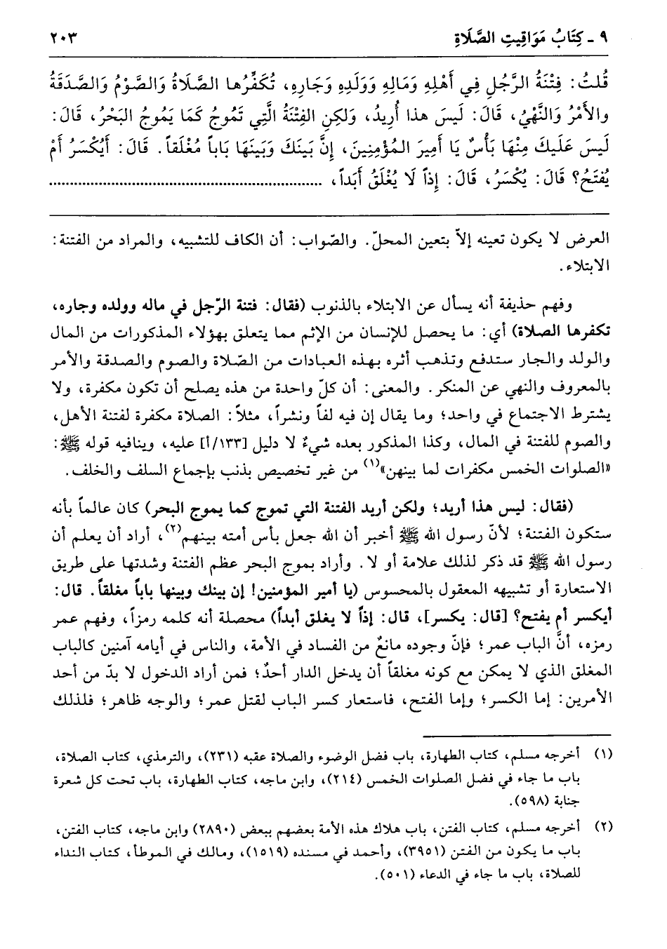 قُلْتُ «فِتْنَةُ الرَّجُلِ فِي أَهْلِهِ وَمَالِهِ وَوَلَدِهِ وَجَارِهِ تُكَفِّرُهَا الصَّلاَةُ وَالصَّوْمُ وَالصَّدَقَةُ وَالأَمْرُ وَالنَّهْىُ». قَالَ لَيْسَ هَذَا أُرِيدُ، وَلَكِنِ الْفِتْنَةُ الَّتِى تَمُوجُ كَمَا يَمُوجُ الْبَحْرُ. قَالَ لَيْسَ عَلَيْكَ مِنْهَا بَأْسٌ يَا أَمِيرَ الْمُؤْمِنِينَ، إِنَّ بَيْنَكَ وَبَيْنَهَا بَابًا مُغْلَقًا. قَالَ أَيُكْسَرُ أَمْ يُفْتَحُ قَالَ يُكْسَرُ. قَالَ إِذًا لاَ يُغْلَقَ أَبَدًا.