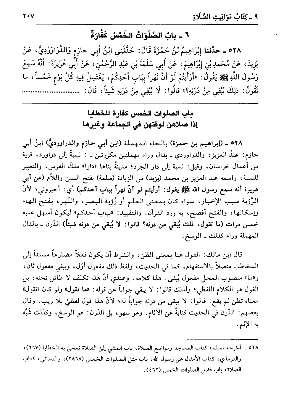 528 - حَدَّثَنَا إِبْرَاهِيمُ بْنُ حَمْزَةَ قَالَ حَدَّثَنِى ابْنُ أَبِى حَازِمٍ وَالدَّرَاوَرْدِىُّ عَنْ يَزِيدَ عَنْ مُحَمَّدِ بْنِ إِبْرَاهِيمَ عَنْ أَبِى سَلَمَةَ بْنِ عَبْدِ الرَّحْمَنِ عَنْ أَبِى هُرَيْرَةَ أَنَّهُ سَمِعَ رَسُولَ اللَّهِ - صلى الله عليه وسلم - يَقُولُ «أَرَأَيْتُمْ لَوْ أَنَّ نَهَرًا بِبَابِ أَحَدِكُمْ، يَغْتَسِلُ فِيهِ كُلَّ يَوْمٍ خَمْسًا، مَا تَقُولُ ذَلِكَ يُبْقِى مِنْ دَرَنِهِ». قَالُوا لاَ يُبْقِى مِنْ دَرَنِهِ شَيْئًا. قَالَ