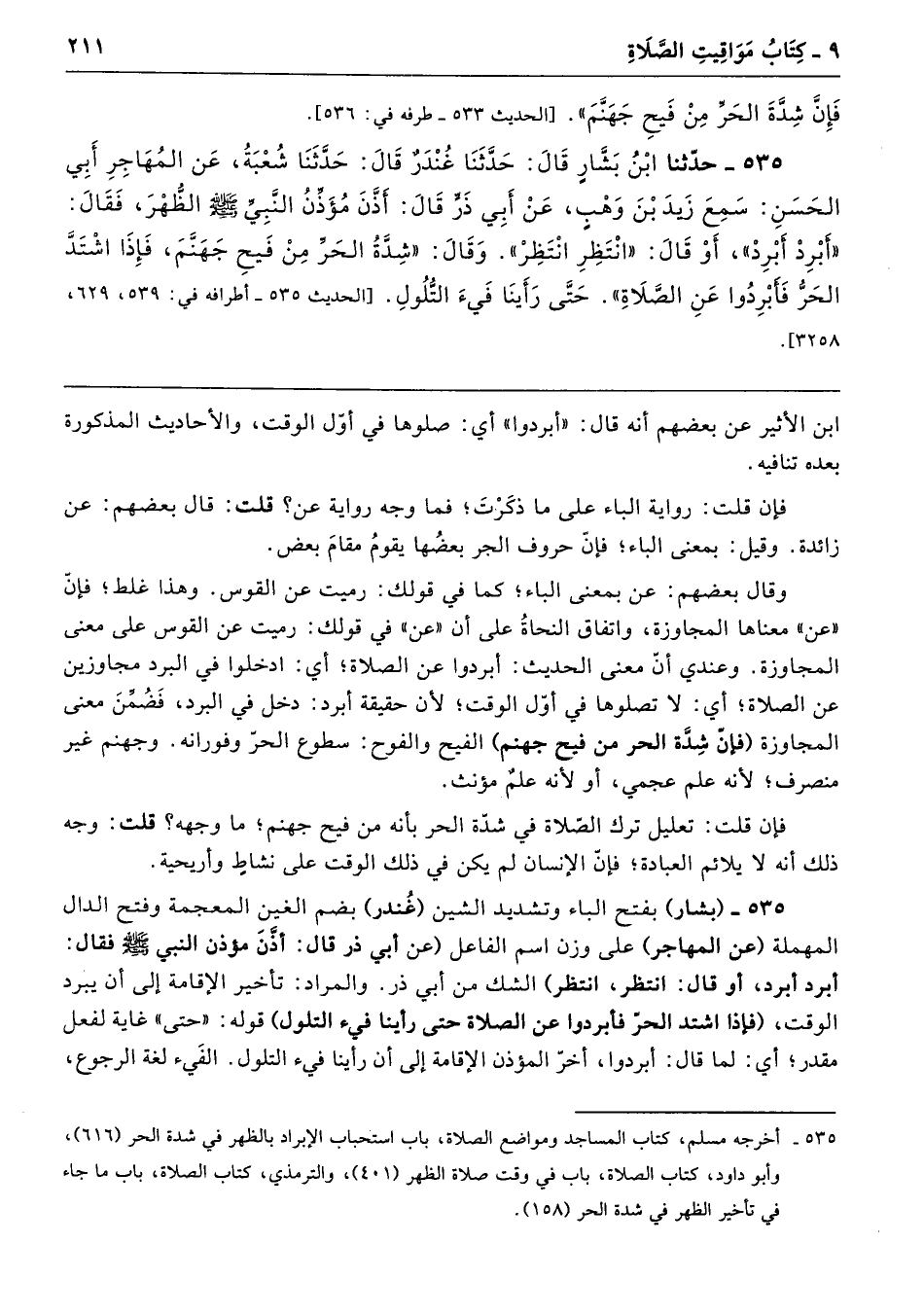 535 - حَدَّثَنَا ابْنُ بَشَّارٍ قَالَ حَدَّثَنَا غُنْدَرٌ قَالَ حَدَّثَنَا شُعْبَةُ عَنِ الْمُهَاجِرِ أَبِى الْحَسَنِ سَمِعَ زَيْدَ بْنَ وَهْبٍ عَنْ أَبِى ذَرٍّ قَالَ أَذَّنَ مُؤَذِّنُ النَّبِيِّ - صلى الله عليه وسلم - الظُّهْرَ فَقَالَ «أَبْرِدْ أَبْرِدْ - أَوْ قَالَ - انْتَظِرِ انْتَظِرْ». وَقَالَ «شِدَّةُ الْحَرِّ مِنْ فَيْحِ جَهَنَّمَ، فَإِذَا اشْتَدَّ الْحَرُّ فَأَبْرِدُوا عَنِ الصَّلاَةِ». حَتَّى رَأَيْنَا فَىْءَ التُّلُولِ. أطرافه 539، 629، 3258