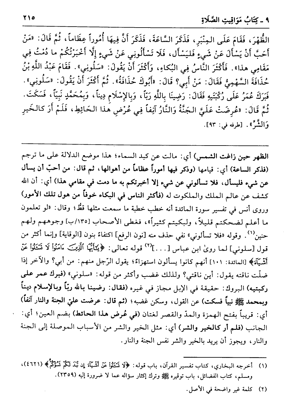 الظهر حين زاغت الشمس) أي: مالت عن كبد السماء؛ هذا موضع الدلالة على ما ترجم (فذكر الساعة) أي: قيامها (وذكر فيها أمورًا عظامًا من أهوالها، ثم قال: من أحبّ أن يسأل عن شيء فليسأل، فلا تسألوني عن شيء إلا أخبرتكم به ما دمت في مقامي هذا) أي: أن الله كشف عن عالم الملك والملكوت له (فأكثر الناس في البكاء خوفًا من هول تلك الأمور) وروى أنس في تفسير سورة المائدة أنه خطب خطبة ما سمعت مثلها قطُّ؛ وقال: "لو تعلمون ما أعلم لضحكتم قليلًا، ولبكيتم كثيرًا"، فغطى الأصحاب وجوههم ولهم حنين. وقوله "فلا تسألوني" نفي حذف منه [نون الرفع] اكتفاءً بنون [الوقاية] وإنما أكثر من قول [سلوني] لما روى ابن عباس [...] قوله تعالى: {يَاأَيُّهَا الَّذِينَ آمَنُوا لَا تَسْأَلُوا عَنْ أَشْيَاءَ} [المائدة: 101] أنهم كانوا يسألون استهزاءً؛ يقول الرّجل منهم: من أبي؟ والآخر إذا ضلّت ناقته يقول: أين ناقتي؟ ولذلك غضب وأكثر من قوله: "سلوني" (فبرك عمر على ركبتيه) البروك: حقيقة في الإبل مجاز في غيره (فقال: رضينا بالله ربًّا وبالإسلام دينًا وبمحمد - صلى الله عليه وسلم - نبيًّا فسكت) عن القول، وسكن غضبه؛ (ثم قال: عرضت عليّ الجنة والنار آنفًا) أي: قريبًا بفتح الهمزة والمدّ والقصر لغتان (في عُرض هذا الحائط) بضم العين؛ أي: الجانب (فلم أر كالخير والشر) أي: مثل الخير والشر من الأسباب الموصلة إلى الجنة والنار، ويجوز أن يريد بالخير والشر نفس الجنة والنار.