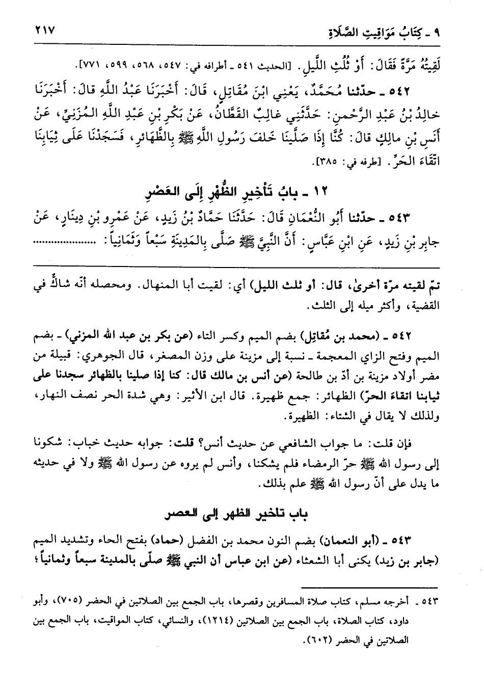542 - (محمد بن مُقاتِل) بضم الميم وكسر التاء (عن بكر بن عبد الله المزني) -بضم الميم وفتح الزاي المعجمة- نسبة إلى مزينة على وزن المصغر، قال الجوهري: قبيلة من مضر أولاد مزينة بن أدّ بن طالحة (عن أنس بن مالك قال: كنا إذا صلينا بالظهائر سجدنا على ثيابنا اتقاءَ الحرّ) الظهائر: جمع ظهيرة. قال ابن الأثير: وهي شدة الحر نصف النهار، ولذلك لا يقال في الشتاء: الظهيرة.