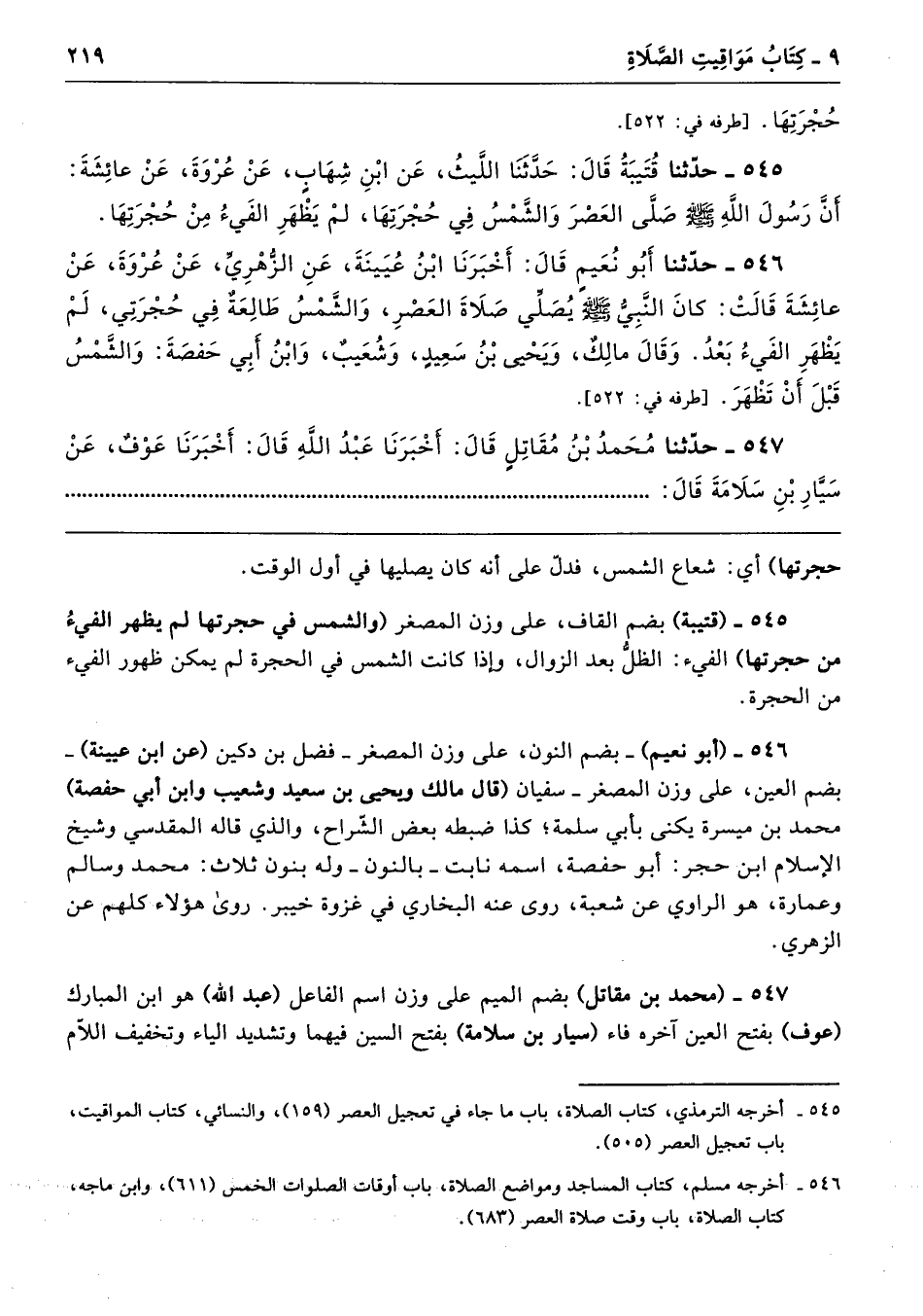 545 - (قتيبة) بضم القاف، على وزن المصغر (والشمس في حجرتها لم يظهر الفيءُ من حجرتها) الفيء: الظلُّ بعد الزوال، وإذا كانت الشمس في الحجرة لم يمكن ظهور الفيء من الحجرة.