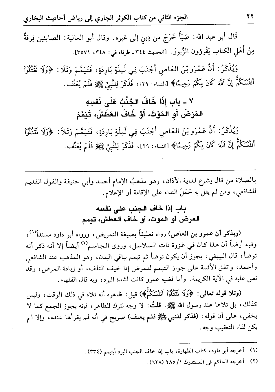 7 - باب إِذَا خَافَ الْجُنُبُ عَلَى نَفْسِهِ الْمَرَضَ أَوِ الْمَوْتَ أَوْ خَافَ الْعَطَشَ، تَيَمَّمَ