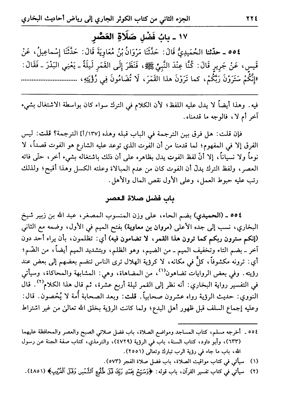 554 - (الحميدي) بضم الحاء، على وزن المنسوب المصغر، عبد الله بن زبير شيخ البخاري، نسب إلى جده الأعلى (مروان بن معاوية) بفتح الميم في الأول، وضمه مع الثاني (إنكم سترون ربكم كما ترون هذا القمر، لا تضامون فيه) أي: تظلمون، بأن يراه أحد دون آخر -بضم التاء وتخفيف الميم- من الضيم، وهو الظلم، وبتشديد الميم أيضًا، من الضّم؛ أي: ترونه مكشوفًا، كلٌّ في مكانه، لا كرؤية الهلال توى الناس تنضم بعضهم إلى بعض عند رؤيته. وفي بعض الروايات تضاهون، من المضاهاة، وهي: المشابهة والمحاكاة، وسيأتي في التفسير رواية البخاري: أنه نظر إلى القمر ليلة أربع عشرة، ثم قال هذا الكلام. قال النووي: حديث الرؤية رواه عشرون صحابيًّا. قلت: وبعد الصحابة أمة لا يُحْصون. قال: