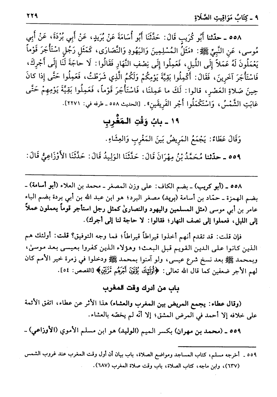 558 - (أبو كريب) -بضم الكاف: على وزن المصغر- محمد بن العلاء (أبو أسامة) -بضم الهمزة - حمّاد بن أسامة (بريد) مصغر البرد؛ هو ابن عبد الله بن أبي بردة بضم الباء عامر بن أبي موسى (مثل المسلمين واليهود والنصارى كمثل رجل استأجر قومًا يعملون عملًا إلى الليل، فعملوا إلى نصف النهار؛ فقالوا: لا حاجة لنا إلى أجرك).