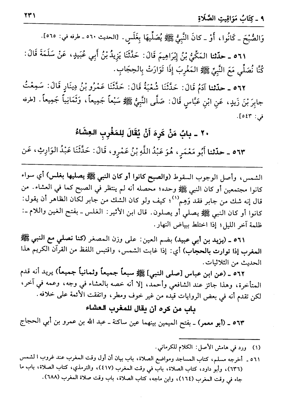 561 - (يزيد بن أبي عبيد) بضم العين: على وزن المصغر كنا نصلي مع النبي - صلى الله عليه وسلم - المغرب إذا توارت بالحجاب) أي: إذا غابت الشمس، واقتبس اللفظ من القرآن الكريم هذا الحديث من الثلاثيات.
