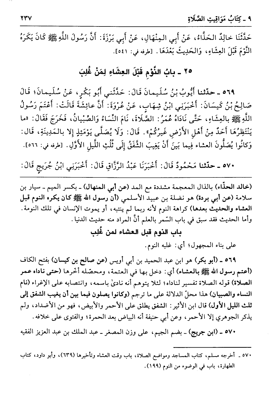 569 - (أبو بكر) هو ابن عبد الحميد بن أبي أويس (عن صالح بن كيسان) بفتح الكاف (أعتم رسول الله - صلى الله عليه وسلم - بالعشاء) أي: دخل بها في العتمة، ومحصّله أخّرها (حتى ناداه عمر الصلاة) قوله الصلاة تفسير لناداه؛ لئلا يتوهم أنه نادى باسمه، وانتصابه على الإغراء (نام النساء والصبيان) هذا محلّ الدلالة على ما ترجم (وكانوا يصلون فيما بين أن يغيب الشفق إلى ثلث الليل الأول) قال ابن الأثير: الشفق يطلق على الأحمر والأبيض، فهو من الأضداد، ولم يذكر الجوهري إلا الأحمر، وعن أبي حنيفة أنه البياض بعد الحمرة؛ والفتوى على خلافه.