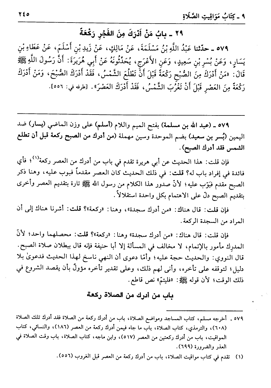 579 - (عبد الله بن مسلمة) بفتح الميم واللام (أسلم) على وزن الماضي (يسار) ضد اليمين (بُسر بن سعيد) بضم الموحدة وسين مهملة (من أدرك من الصبح ركعة قبل أن تطلع الشمس فقد أدرك الصبح).