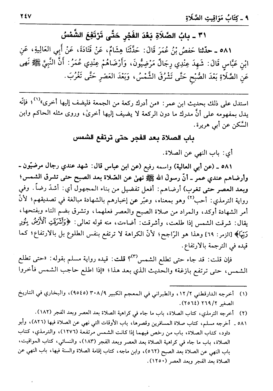 581 - حَدَّثَنَا حَفْصُ بْنُ عُمَرَ قَالَ حَدَّثَنَا هِشَامٌ عَنْ قَتَادَةَ عَنْ أَبِى الْعَالِيَةِ عَنِ ابْنِ عَبَّاسٍ قَالَ شَهِدَ عِنْدِى رِجَالٌ مَرْضِيُّونَ وَأَرْضَاهُمْ عِنْدِى عُمَرُ أَنَّ النَّبِىَّ - صلى الله عليه وسلم - نَهَى عَنِ الصَّلاَةِ بَعْدَ الصُّبْحِ حَتَّى تَشْرُقَ الشَّمْسُ، وَبَعْدَ الْعَصْرِ حَتَّى تَغْرُبَ.