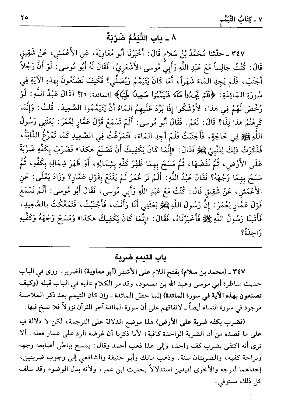 347 - (محمَّد بن سلام) بفتح اللام على الأشهر (أبو معاوية) الضَّرير. روى في الباب حديث مناظرة أبي موسى وعبد الله بن مسعود، وقد مر الكلام عليه في الباب قبله (وكيف تصنعون بهذه الآية في سورة المائدة) إنما خصّ المائدة -وإن كان التيمم بعد ذكر الملامسة موجود في سورة النساء أَيضًا- لاتفاقهم على أن سورة المائدة آخر القرآن نزولًا فلا نسخ فيها.