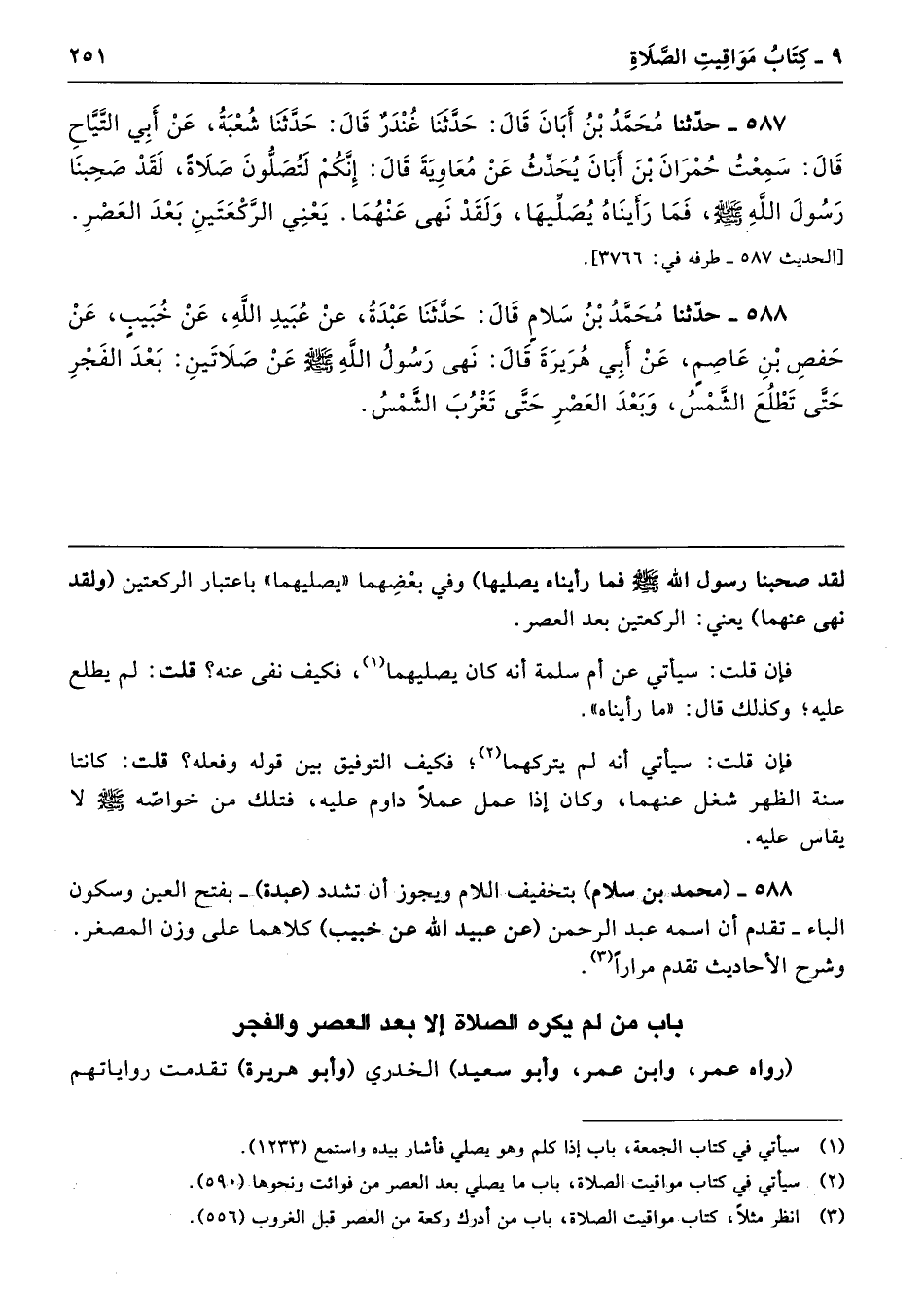 588 - حَدَّثَنَا مُحَمَّدُ بْنُ سَلاَمٍ قَالَ حَدَّثَنَا عَبْدَةُ عَنْ عُبَيْدِ اللَّهِ عَنْ خُبَيْبٍ عَنْ حَفْصِ بْنِ عَاصِمٍ عَنْ أَبِى هُرَيْرَةَ قَالَ نَهَى رَسُولُ اللَّهِ - صلى الله عليه وسلم - عَنْ صَلاَتَيْنِ بَعْدَ الْفَجْرِ حَتَّى تَطْلُعَ الشَّمْسُ، وَبَعْدَ الْعَصْرِ حَتَّى تَغْرُبَ الشَّمْسُ.