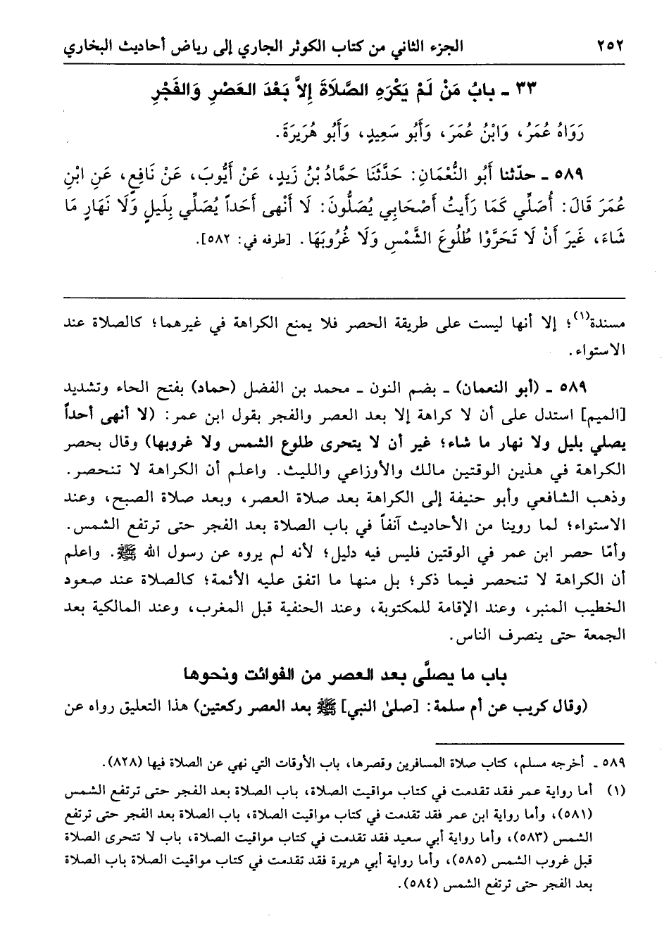 589 - (أبو النعمان) -بضم النون- محمد بن الفضل (حماد) بفتح الحاء وتشديد [الميم] استدل على أن لا كراهة إلا بعد العصر والفجر بقول ابن عمر: (لا أنهى أحدًا يصلي بليل ولا نهار ما شاء؛ غير أن لا يتحرى طلوع الشمس ولا غروبها) وقال بحصر الكراهة في هذين الوقتين مالك والأوزاعي والليث. واعلم أن الكراهة لا تنحصر. وذهب الشافعي وأبو حنيفة إلى الكراهة بعد صلاة العصر، وبعد صلاة الصبح، وعند الاستواء؛ لما روينا من الأحاديث آنفًا في باب الصلاة بعد الفجر حتى ترتفع الشمس. وأمًا حصر ابن عمر في الوقتين فليس فيه دليل؛ لأنه لم يروه عن رسول الله - صلى الله عليه وسلم -. واعلم أن الكراهة لا تنحصر فيما ذكر؛ بل منها ما اتفق عليه الأئمة؛ كالصلاة عند صعود الخطيب المنبر، وعند الإقامة للمكتوبة، وعند الحنفية قبل المغرب، وعند المالكية بعد الجمعة حتى ينصرف الناس.