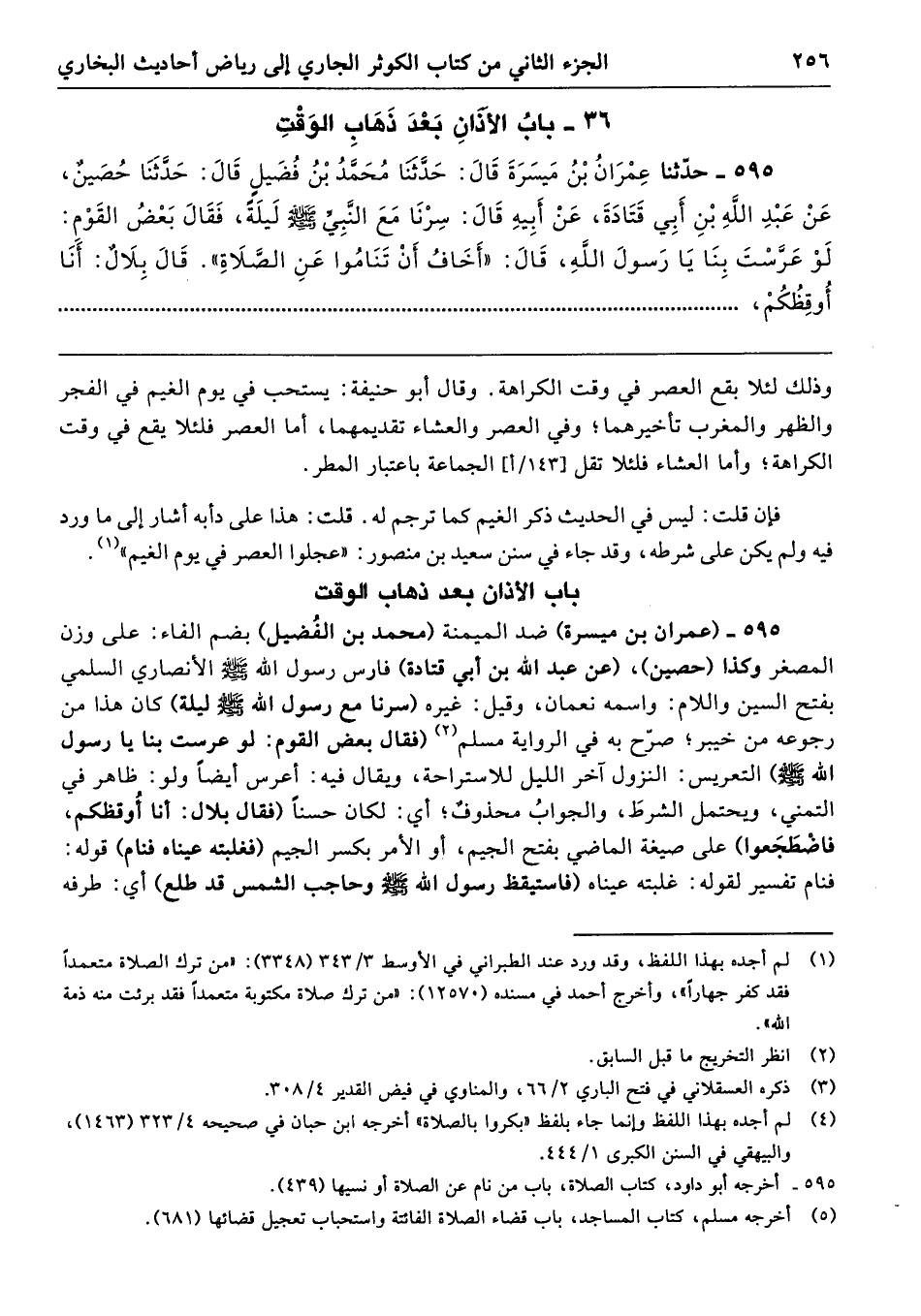 595 - (عمران بن ميسرة) ضد الميمنة (محمد بن الفُضيل) بضم الفاء: على وزن المصغر وكذا (حصين)، (عن عبد الله بن أبي قتادة) فارس رسول الله - صلى الله عليه وسلم - الأنصاري السلمي بفتح السين واللام: واسمه نعمان، وقيل: غيره (سرنا مع رسول الله - صلى الله عليه وسلم - ليلة) كان هذا من رجوعه من خيبر؛ صرّح به في الرواية مسلم (فقال بعض القوم: لو عرست بنا يا رسول الله - صلى الله عليه وسلم -) التعريس: النزول آخر الليل للاستراحة، ويقال فيه: أعرست أيضًا ولو: ظاهر في التمني، ويحتمل الشرطَ، والجوابُ محذوف؛ أي: لكان حسنًا (فقال بلال: أنا أُوقظكم، فاضْطَجَعوا) على صيغة الماضي بفتح الجيم، أو الأمر بكسر الجيم (فغلبنه عيناه فنام) قوله: فنام تفسير لقوله: غلبته عيناه (فاستيقظ رسول الله - صلى الله عليه وسلم - وحاجب الشمس قد طلع) أي: طرفه