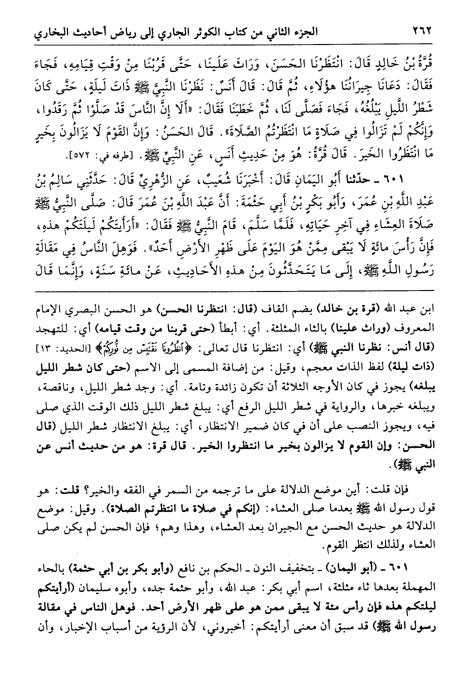 ابن عبد الله (قرة بن خالد) بضم القاف (قال: انتظرنا الحسن) هو الحسن البصري الإمام المعروف (وراث علينا) بالثاء المثلثة. أي: أبطأ (حتى قربنا من وقت قيامه) أي: للتهجد (قال أنس: نظرنا النبي - صلى الله عليه وسلم -) أي: انتظرنا قال تعالى: {انْظُرُونَا نَقْتَبِسْ مِنْ نُورِكُمْ} [الحديد: 13] (ذات ليلة) لفظ الذات معجم، وقيل: من إضافة المسمى إلى الاسم (حتى كان شطر الليل يبلغه) يجوز في كان الأوجه الثلاثة أن تكون زائدة وتامة. أي: وجد شطر الليل، وناقصة، ويبلغه خبرها، والرواية في شطر الليل الرفع أي: يبلغ شطر الليل ذلك الوقت الذي صلى فيه، ويجوز النصب على أن في كان ضمير الانتظار، أي: يبلغ الانتظار شطر الليل (قال الحسن: وإن القوم لا يزالون بخير ما انتظروا الخير. قال قرة: هو من حديث أنس عن النبي - صلى الله عليه وسلم -).
