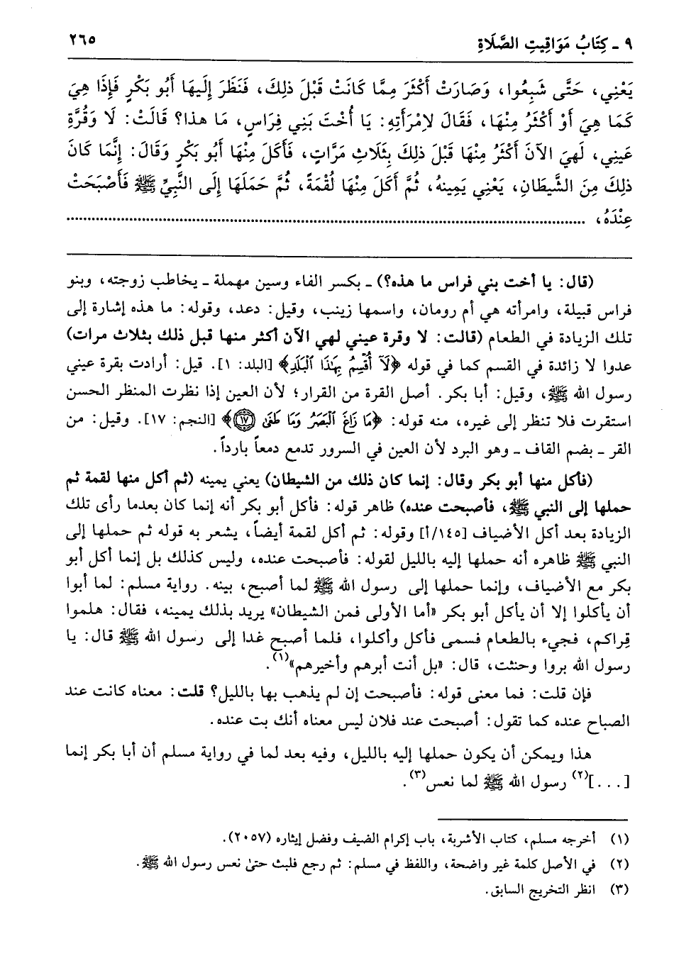 يَعْنِى حَتَّى شَبِعُوا وَصَارَتْ أَكْثَرَ مِمَّا كَانَتْ قَبْلَ ذَلِكَ، فَنَظَرَ إِلَيْهَا أَبُو بَكْرٍ فَإِذَا هِىَ كَمَا هِىَ أَوْ أَكْثَرُ مِنْهَا. فَقَالَ لاِمْرَأَتِهِ يَا أُخْتَ بَنِى فِرَاسٍ مَا هَذَا قَالَتْ لاَ وَقُرَّةِ عَيْنِى لَهِىَ الآنَ أَكْثَرُ مِنْهَا قَبْلَ ذَلِكَ بِثَلاَثِ مَرَّاتٍ. فَأَكَلَ مِنْهَا أَبُو بَكْرٍ وَقَالَ إِنَّمَا كَانَ ذَلِكَ مِنَ الشَّيْطَانِ - يَعْنِى يَمِينَهُ - ثُمَّ أَكَلَ مِنْهَا لُقْمَةً، ثُمَّ حَمَلَهَا إِلَى النَّبِيِّ - صلى الله عليه وسلم - فَأَصْبَحَتْ عِنْدَهُ،