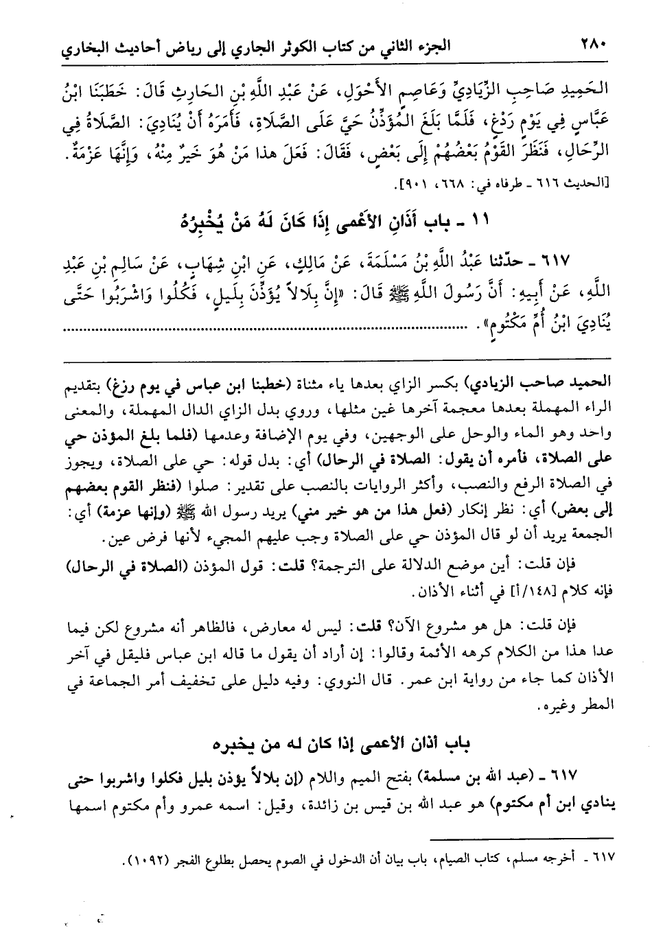617 - (عبد الله بن مسلمة) بفتح الميم واللام (إن بلالًا يؤذن بليل فكلوا واشربوا حنى ينادي ابن أم مكتوم) هو عبد الله بن قيس بن زائدة، وقيل: اسمه عمرو وأم مكتوم اسمها