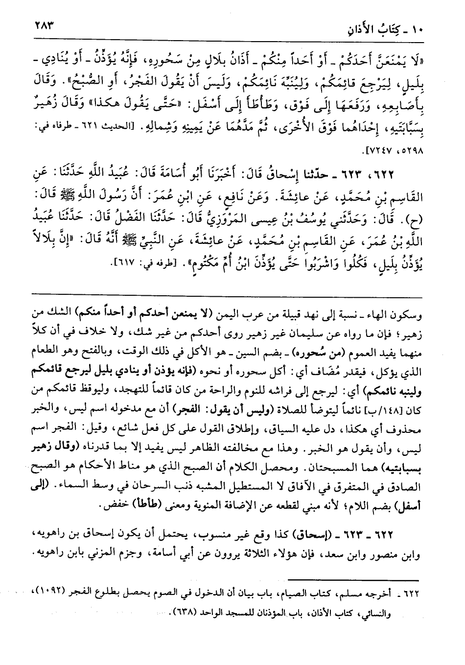 622 - حَدَّثَنَا إِسْحَاقُ قَالَ أَخْبَرَنَا أَبُو أُسَامَةَ قَالَ عُبَيْدُ اللَّهِ حَدَّثَنَا عَنِ الْقَاسِمِ بْنِ مُحَمَّدٍ عَنْ عَائِشَةَ. وَعَنْ نَافِعٍ عَنِ ابْنِ عُمَرَ أَنَّ رَسُولَ اللَّهِ - صلى الله عليه وسلم - قَالَ: وَحَدَّثَنِى يُوسُفُ بْنُ عِيسَى الْمَرْوَزِىُّ قَالَ حَدَّثَنَا الْفَضْلُ قَالَ حَدَّثَنَا عُبَيْدُ اللَّهِ بْنُ عُمَرَ عَنِ الْقَاسِمِ بْنِ مُحَمَّدٍ عَنْ عَائِشَةَ عَنِ النَّبِيِّ - صلى الله عليه وسلم - أَنَّهُ قَالَ «إِنَّ بِلاَلاً يُؤَذِّنُ بِلَيْلٍ، فَكُلُوا وَاشْرَبُوا حَتَّى يُؤَذِّنَ ابْنُ أُمِّ مَكْتُومٍ». طرفه 617