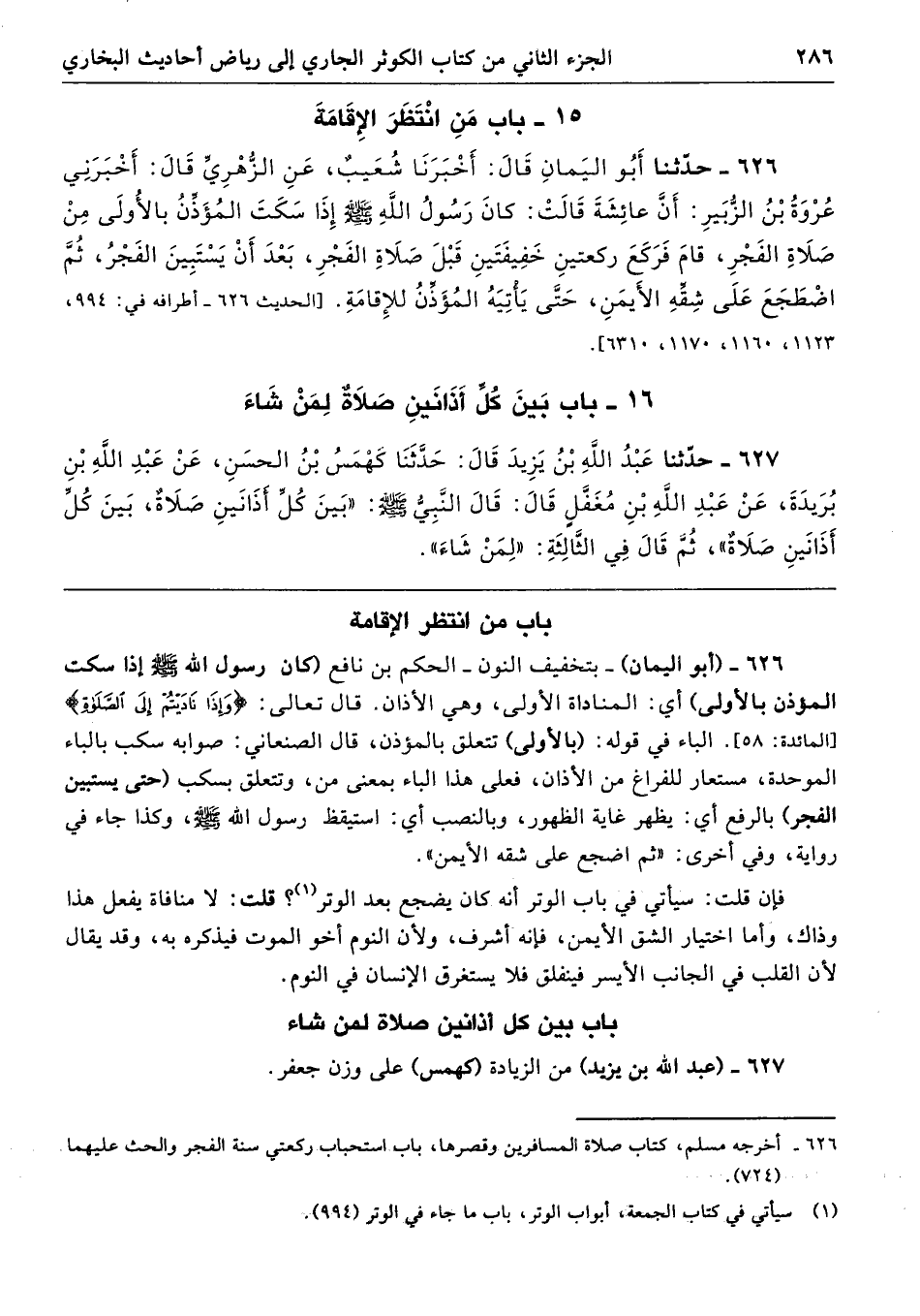 626 - (أبو اليمان) -بتخفيف النون- الحكم بن نافع (كان رسول الله - صلى الله عليه وسلم - إذا سكت الموذن بالأولى) أي: المناداة الأولى، وهي الأذان. قال تعالى: {وَإِذَا نَادَيْتُمْ إِلَى الصَّلَاةِ} [المائدة: 58] الباء في قوله: (بالأولى) تتعلق بالمؤذن، قال الصنعاني: صوابه سكب بالباء الموحدة، مستعار للفراغ من الأذان، فعلى هذا الباء بمعنى من، وتتعلق بسكب (حتى يستبين الفجر) بالرفع أي: يظهر غاية الظهور، وبالنصب أي: استيقظ وسول الله - صلى الله عليه وسلم -، وكذا جاء في رواية، وفي أخرى: "ثم اضجع على شقه الأيمن".