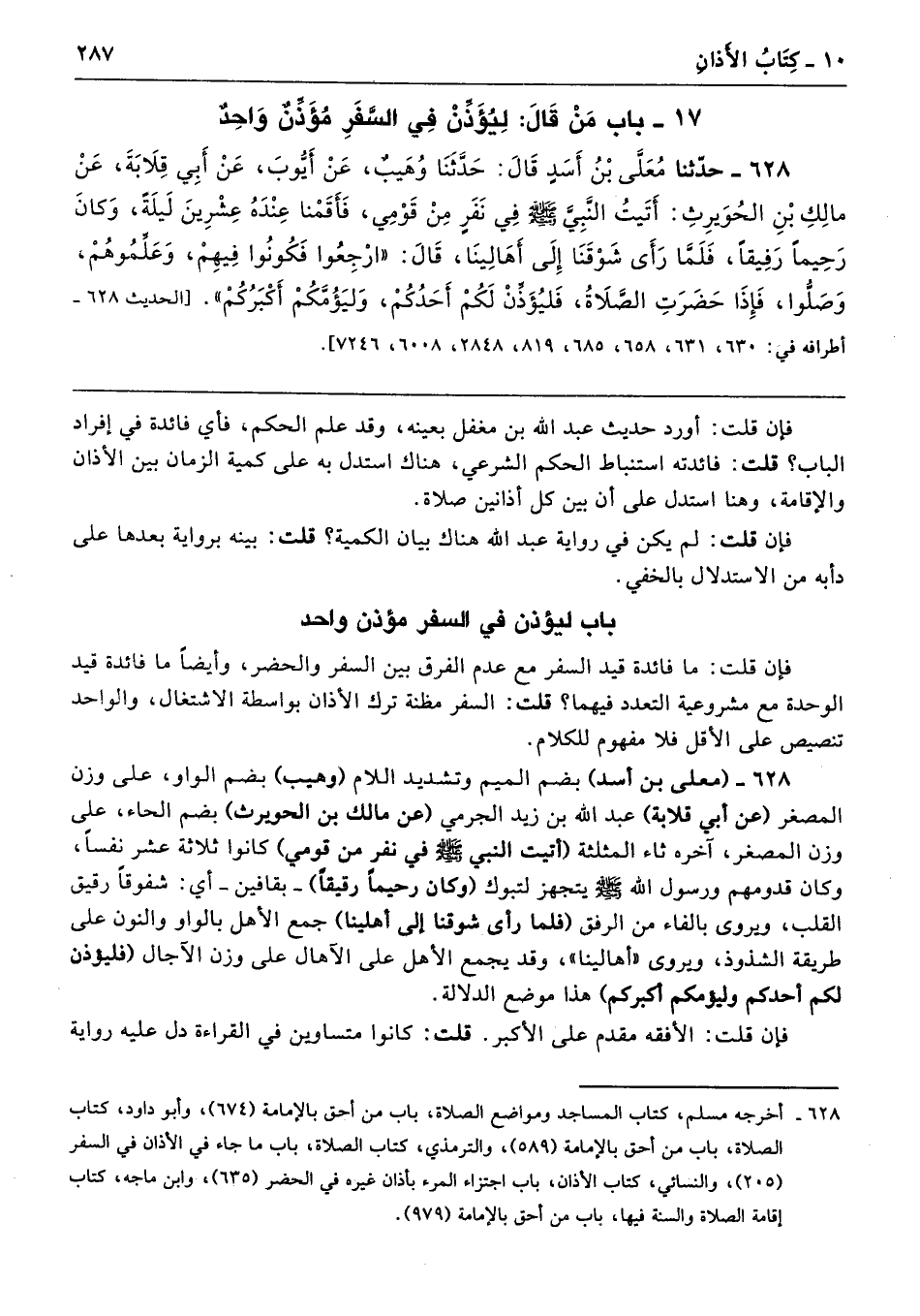 628 - (معلى بن أسد) بضم الميم وتشديد اللام (وهيب) بضم الواو، على وزن المصغر (عن أبي فلابة) عبد الله بن زيد الجرمي (عن مالك بن الحويرث) بضم الحاء، على وزن المصغر، آخره شاء المثلثة (أتيت النبي - صلى الله عليه وسلم - في نفر من قومي) كانوا ثلاثة عشر نفسًا، وكان قدومهم ورسول الله - صلى الله عليه وسلم - يتجهز لتبوك (وكان رحيمًا رقيقًا) -بقافين- أي: شفوقًا رقيق القلب، ويروى بالفاء من الرفق (فلما رأى شوقنا إلى أهلينا) جمع الأهل بالواو والنون على طريقة الشذوذ، ويروى "أهالينا"، وقد يجمع الأهل على الآهال على وزن الآجال (فليوذن لكم أحدكم وليؤمكم أكبركم) هذا موضع الدلالة.