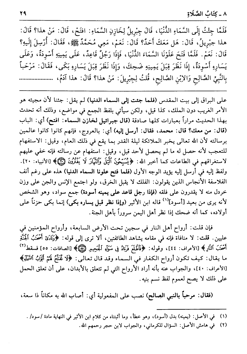 على البراق إلى بيت المقدس (فلما جئت إلى السماء الدنيا) لم يقل: جئنا لأن مجيئه هو الأمر الغريب دون الملك، كذا قيل، ولكن سيأتي بلفظ الجمع في مواضع، وذلك أنَّه تحدث بهذا الحديث مرارًا بعبارات كلها صادقة (قال جبرائيل لخازن السماء: افتح) أي: الباب (قال: من معك؟ قال: محمَّد، فقال: أرسل إليه) أي: بالعروج، فإنهم كانوا كانوا عالمين برسالته لأن الله تعالى يخبر الملائكة ليلة القدر بما يقع في ذلك العام، وقيل: الاستفهام للتعجب لأنه حصل له ما لم يحصل لأحد قبل، وقيل: استفهام عن رسالته فإنَّه خفي عليهم لاستغراقهم في الطاعات كما أخبر الله: {يُسَبِّحُونَ اللَّيْلَ وَالنَّهَارَ لَا يَفْتُرُونَ (20)} [الأنبياء: 20]. ولفظ إليه في أرسل إليه يؤيد الوجه الأول (فلما فتح علونا السماء الدنيا) هذه على رغم أنف الفلاسفة الأنجاس الذين يقولون: الفلك لا يقبل الخرق، ولو اجتمع الإنس والجن على وزن خردل منه لا يقدرون على فلقه (فإذا رجل قاعد على يمينه أسودة) جمع سواد، وهو الشخص لأنه يرى من بعيد [أسود] قاله ابن الأثير (وإذا نظر قبل يساره بكى) إنما بكى حزنًا على أولاده، كما أنَّه ضحك إذا نظر أهل اليمن سرورًا بأهل الجنة.