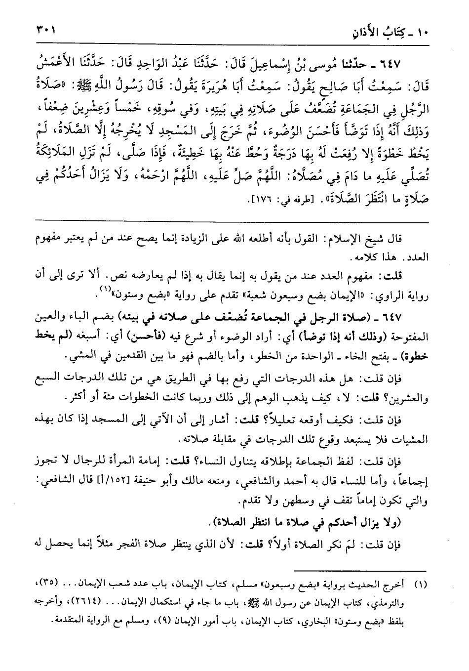 647 - (صلاة الرجل في الجماعة تُضعّف على صلاته في بيته) بضم الباء والعين المفتوحة (وذلك أنه إذا توضأ) أي: أراد الوضوء أو شرع فيه (فاحسن) أي: أسبغه (لم يخط خطوة) -بفتح الخاء- الواحدة من الخطو، وأما بالضم فهو ما بين القدمين في المشي.