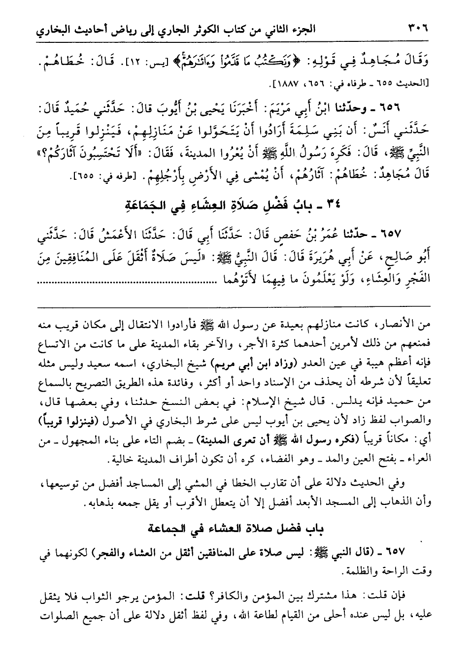 656 - وَقَالَ ابْنُ أَبِى مَرْيَمَ أَخْبَرَنَا يَحْيَى بْنُ أَيُّوبَ حَدَّثَنِى حُمَيْدٌ حَدَّثَنِى أَنَسٌ أَنَّ بَنِى سَلِمَةَ أَرَادُوا أَنْ يَتَحَوَّلُوا عَنْ مَنَازِلِهِمْ فَيَنْزِلُوا قَرِيبًا مِنَ النَّبِيِّ - صلى الله عليه وسلم - قَالَ فَكَرِهَ رَسُولُ اللَّهِ - صلى الله عليه وسلم - أَنْ يُعْرُوا {الْمَدِينَةَ} فَقَالَ «أَلاَ تَحْتَسِبُونَ آثَارَكُمْ». قَالَ مُجَاهِدٌ خُطَاهُمْ آثَارُهُمْ أَنْ يُمْشَى فِي الأَرْضِ بِأَرْجُلِهِمْ. طرفه 655