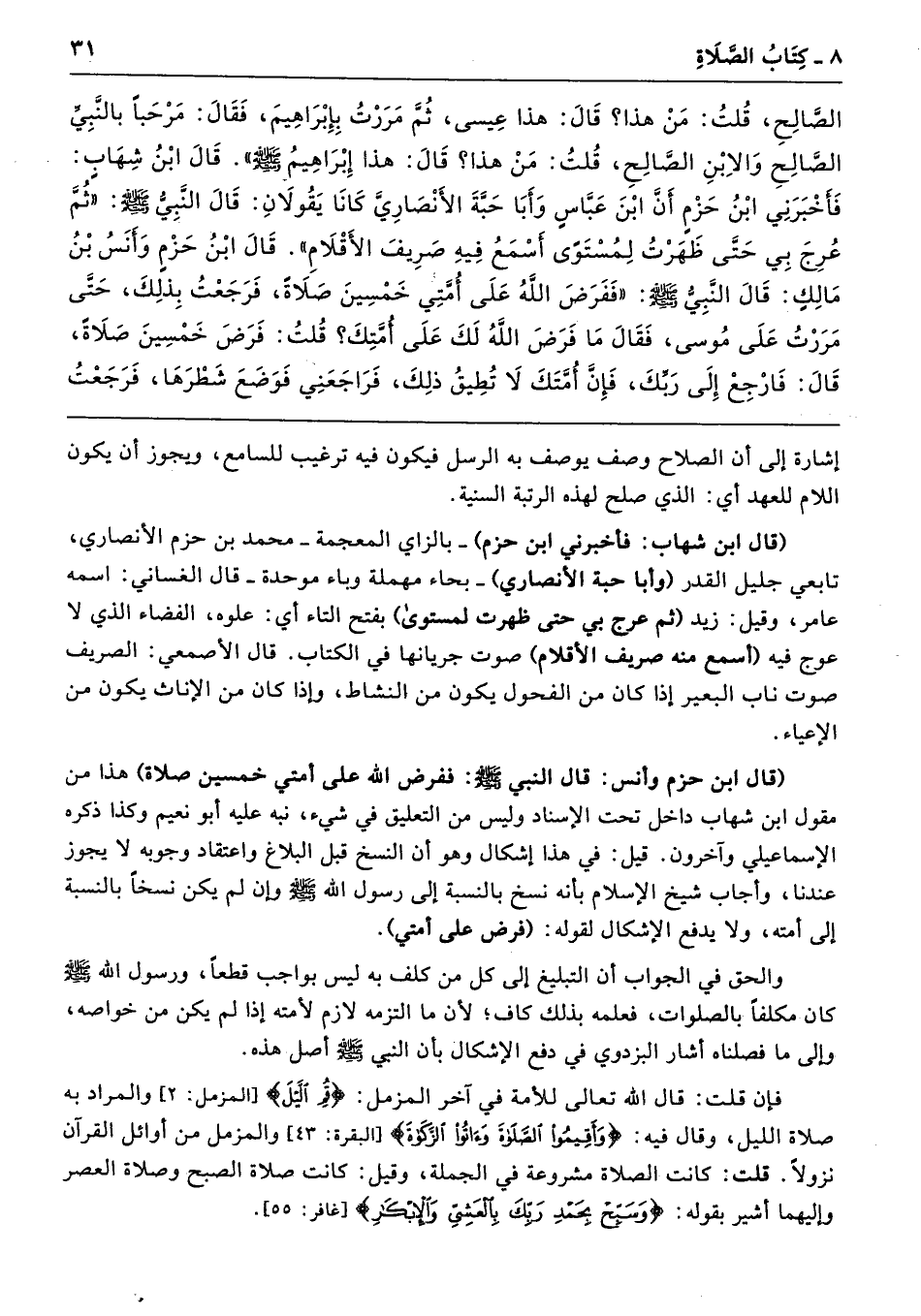 الصَّالِحِ. قُلْتُ مَنْ هَذَا قَالَ هَذَا عِيسَى. ثُمَّ مَرَرْتُ بِإِبْرَاهِيمَ فَقَالَ مَرْحَبًا بِالنَّبِيِّ الصَّالِحِ وَالاِبْنِ الصَّالِحِ. قُلْتُ مَنْ هَذَا قَالَ هَذَا إِبْرَاهِيمُ - صلى الله عليه وسلم -». قَالَ ابْنُ شِهَابٍ فَأَخْبَرَنِى ابْنُ حَزْمٍ أَنَّ ابْنَ عَبَّاسٍ وَأَبَا حَبَّةَ الأَنْصَارِىَّ كَانَا يَقُولاَنِ قَالَ النَّبِىُّ - صلى الله عليه وسلم - «ثُمَّ عُرِجَ بِى حَتَّى ظَهَرْتُ لِمُسْتَوًى أَسْمَعُ فِيهِ صَرِيفَ الأَقْلاَمِ». قَالَ ابْنُ حَزْمٍ وَأَنَسُ بْنُ مَالِكٍ قَالَ النَّبِىُّ - صلى الله عليه وسلم - «فَفَرَضَ اللَّهُ عَلَى أُمَّتِى خَمْسِينَ صَلاَةً، فَرَجَعْتُ بِذَلِكَ حَتَّى مَرَرْتُ عَلَى مُوسَى فَقَالَ مَا فَرَضَ اللَّهُ لَكَ عَلَى أُمَّتِكَ قُلْتُ فَرَضَ خَمْسِينَ صَلاَةً. قَالَ فَارْجِعْ إِلَى رَبِّكَ، فَإِنَّ أُمَّتَكَ لاَ تُطِيقُ ذَلِكَ. فَرَاجَعْتُ فَوَضَعَ شَطْرَهَا، فَرَجَعْتُ