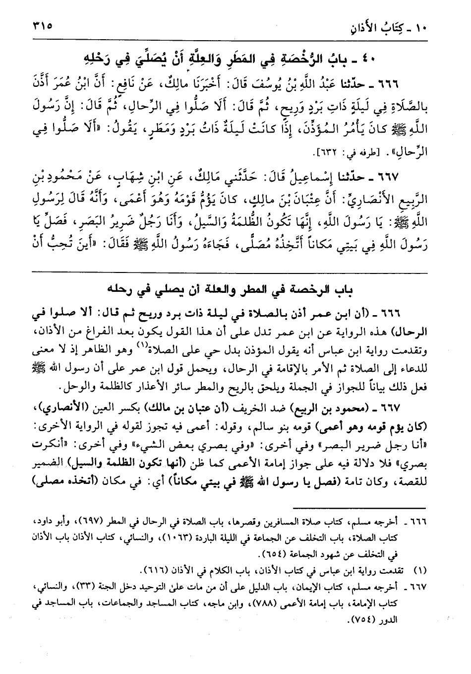 666 - (أن ابن عمر أذن بالصلاة في ليلة ذات برد وريح ثم قال: ألا صلوا في الرحال) هذه الرواية عن ابن عمر تدل على أن هذا القول يكون بعد الفراغ من الأذان، وتقدمت رواية ابن عباس أنه يقول المؤذن بدل حي على الصلاة وهو الظاهر إذ لا معنى للدعاء إلى الصلاة ثم الأمر بالإقامة في الرحال، ويحمل قول ابن عمر على أن رسول الله -صلى الله عليه وسلم- فعل ذلك بيانًا للجواز في الجملة ويلحق بالريح والمطر سائر الأعذار كالظلمة والوحل.
