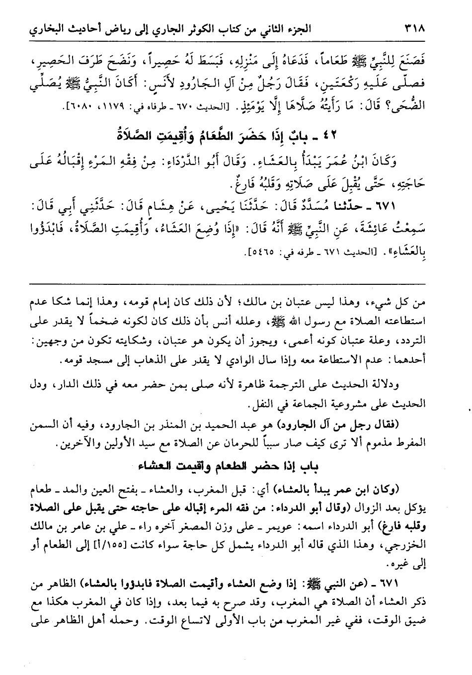 671 - (عن النبي -صلى الله عليه وسلم-: إذا وضع العشاء وأقيمت الصلاة فابدؤوا بالعشاء) الظاهر من ذكر العشاء أن الصلاة هي المغرب، وقد صرح به فيما بعد، وإذا كان في المغرب هكذا مع ضيق الوقت، ففي غير المغرب من باب الأولى لاتساع الوقت. وحمله أهل الظاهر على