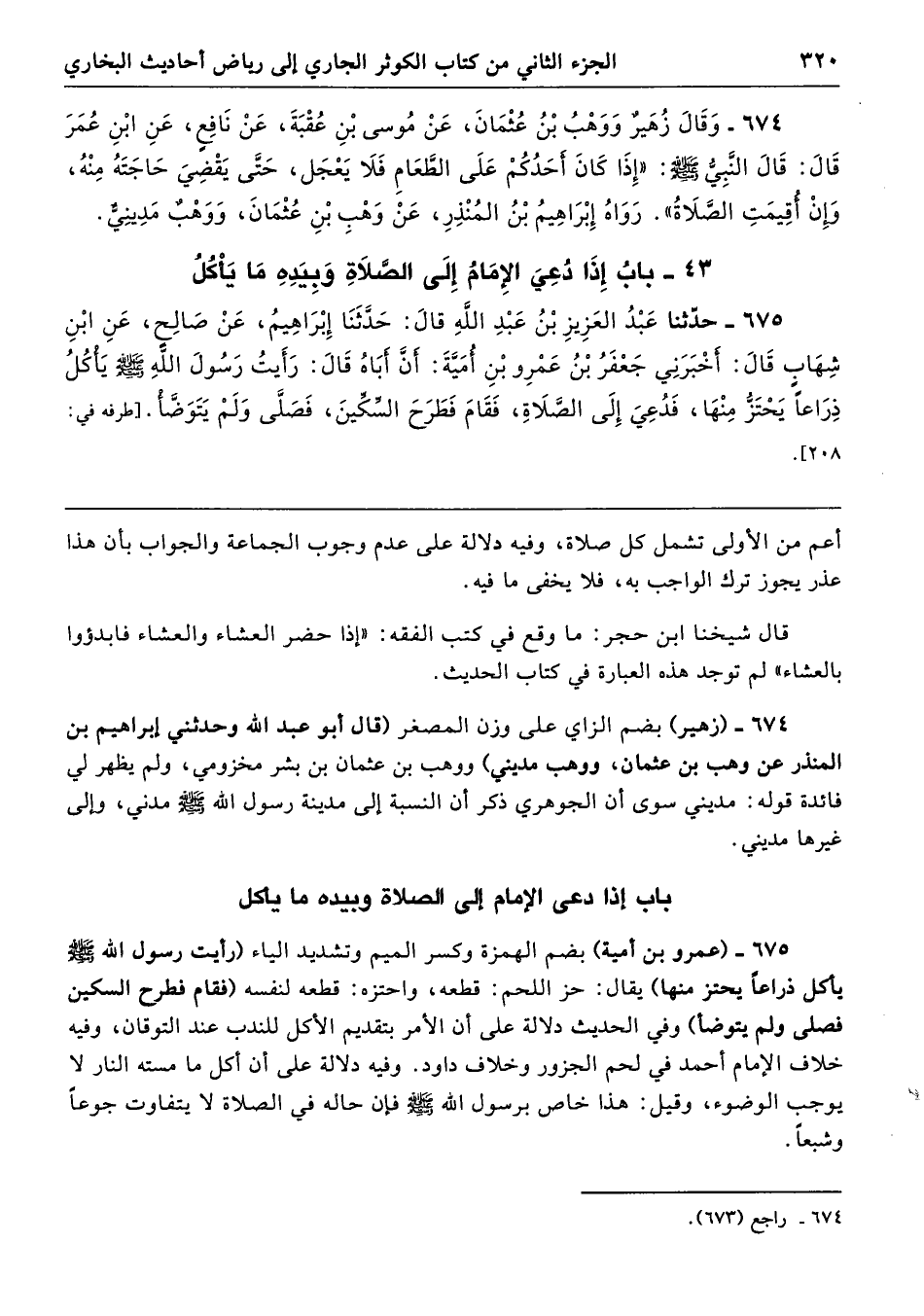 675 - (عمرو بن أمية) بضم الهمزة وكسر الميم وتشديد الياء (رأيت رسول الله -صلى الله عليه وسلم- يأكل ذراعًا يحتز منها) يقال: حز اللحم: قطعه، واحتزه: قطعه لنفسه (فقام فطرح السكين فصلى ولم يتوضأ) وفي الحديث دلالة على أن الأمر بتقديم الأكل للندب عند التوقان، وفيه خلاف الإمام أحمد في لحم الجزور وخلاف داود. وفيه دلالة على أن أكل ما مسته النار لا يوجب الوضوء، وقيل: هذا خاص برسول الله - صلى الله عليه وسلم - فإن حاله في الصلاة لا يتفاوت جوعًا وشبعًا.