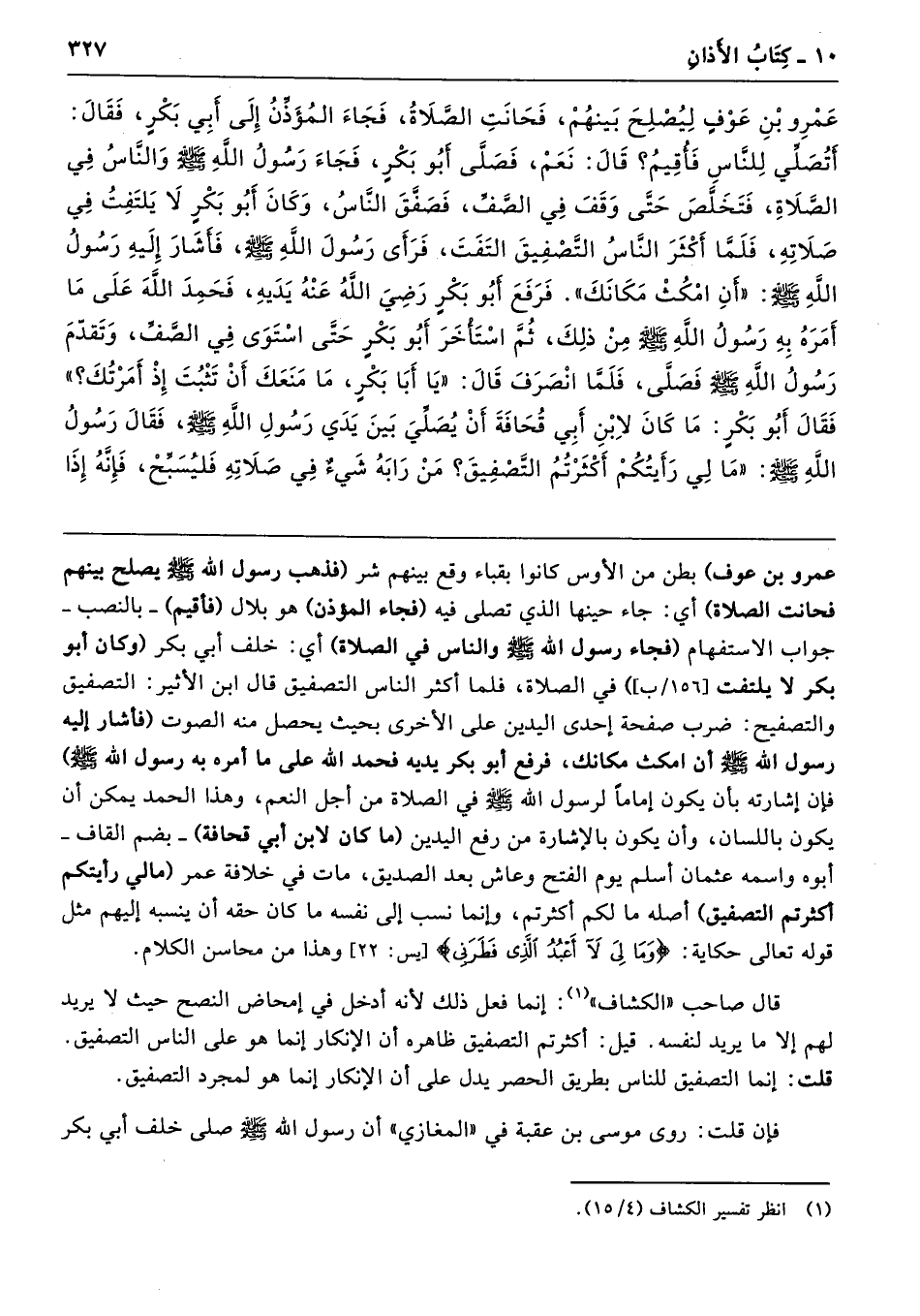 عمرو بن عوف) بطن من الأوس كانوا بقباء وقع بينهم شر (فذهب رسول الله -صلى الله عليه وسلم- يصلح بينهم فحانت الصلاة) أي: جاء حينها الذي تصلى فيه (فجاء الموذن) هو بلال (فأقيم) -بالنصب- جواب الاستفهام (فجاء رسول الله -صلى الله عليه وسلم- والناس في الصلاة) أي: خلف أبي بكر (وكان أبو بكر لا يلتفت) في الصلاة، فلما أكثر الناس التصفيق قال ابن الأثير: التصفيق والتصفيح: ضرب صفحة إحدى اليدين على الأخرى بحيث يحصل منه الصوت (فأشار إليه رسول الله -صلى الله عليه وسلم- أن امكث مكانك، فرفع أبو بكر يديه فحمد الله على ما أمره به رسول الله -صلى الله عليه وسلم-) فإن إشارته بأن يكون إمامًا لرسول الله - صلى الله عليه وسلم - في الصلاة من أجل النعم، وهذا الحمد يمكن أن يكون باللسان، وأن يكون بالإشارة من رفع اليدين (ما كان لابن أبي قحافة) -بضم القاف- أبوه واسمه عثمان أسلم يوم الفتح وعاش بعد الصديق، مات في خلافة عمر (ما لي رأيتكم أكثرتم التصفيق) أصله ما لكم أكثرتم، وإنما نسب إلى نفسه ما كان حقه أن ينسبه إليهم مثل قوله تعالى حكاية: {وَمَا لِيَ لَا أَعْبُدُ الَّذِي فَطَرَنِي} [يس: 22] وهذا من محاسن الكلام.