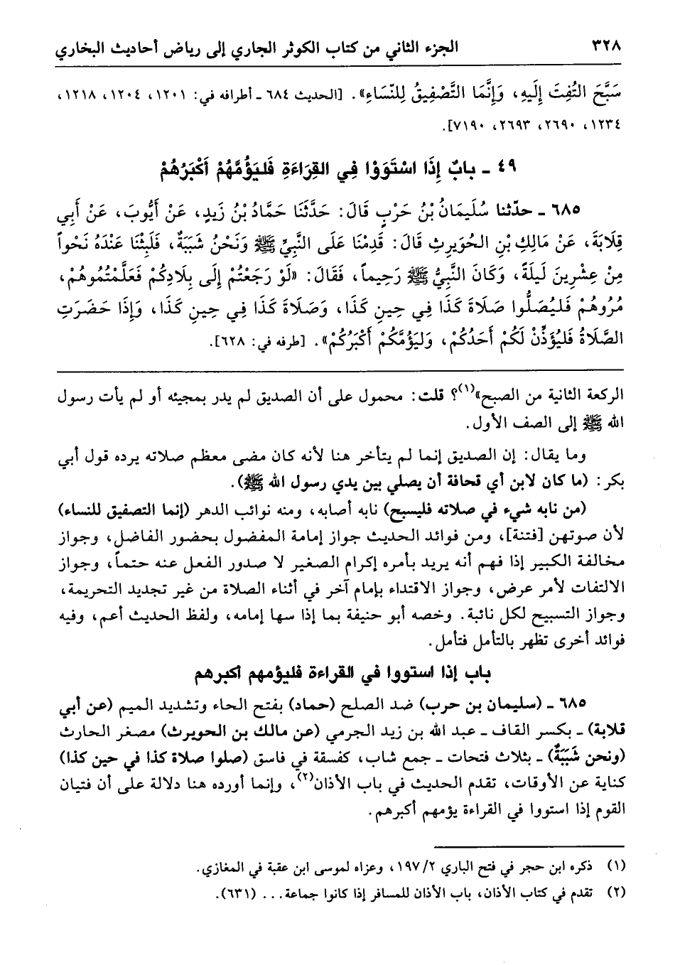 685 - (سليمان بن حرب) ضد الصلح (حماد) بفتح الحاء وتشديد الميم (عن أبي قلابة) -بكسر القاف- عبد الله بن زيد الجرمي (عن مالك بن الحويرث) مصغر الحارث (ونحن شَبَبَة) -بثلاث فتحات- جمع شاب، كفسقة في فاسق (صلوا صلاة كذا في حين كذا) كناية عن الأوقات، تقدم الحديث في باب الأذان، وإنما أورده هنا دلالة على أن فتيان القوم إذا استووا في القراءة يؤمهم أكبرهم.