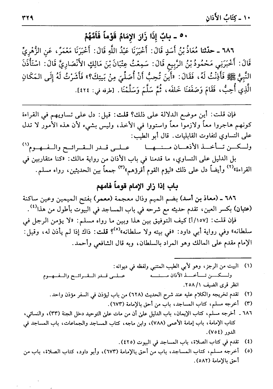 686 - (معاذ بن أسد) بضم الميم وذال معجمة (معمر) بفتح الميمين وعين ساكنة (عتبان) بكسر العين، تقدم حديثه مع شرحه في باب المساجد في البيوت بأطول من هذا.