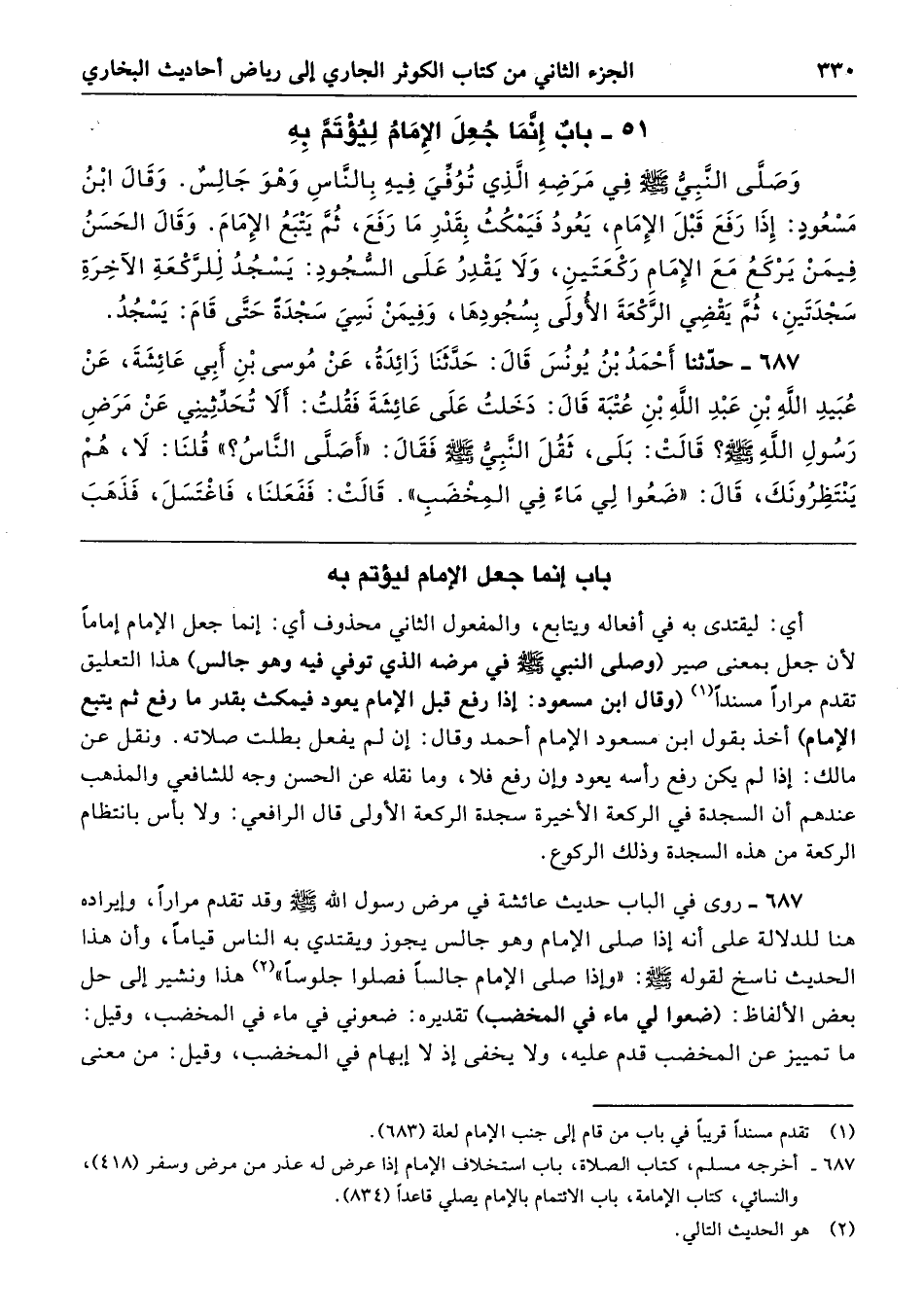 687 - روى في الباب حديث عائشة في مرض رسول الله -صلى الله عليه وسلم- وقد تقدم مرارًا، وإيراده هنا للدلالة على أنه إذا صلى الإمام وهو جالس يجوز ويقتدي به الناس قيامًا، وأن هذا الحديث ناسخ لقوله - صلى الله عليه وسلم -: "وإذا صلى الإمام جالسًا فصلوا جلوسًا" هذا ونشير إلى حل بعض الألفاظ: (ضعوا لي ماء في المخضب) تقديره: ضعوني في ماء في المخضب، وقيل: ما تمييز عن المخضب قدم عليه، ولا يخفى إذ لا إبهام في المخضب، وقيل: من معنى